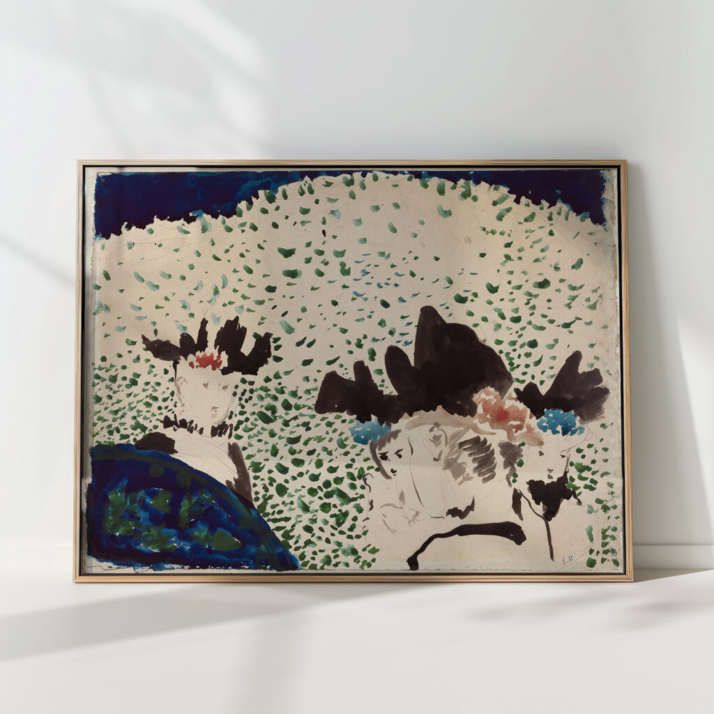 This piece by Édouard Vuillard, titled “Four Ladies with Fancy Hats,” portrays a quartet of women in elaborate hats, with a focus on feminine elegance and social interaction. The image is characterized by expressive brushwork and a vibrant color palette, conveying the Post-Impressionist movement’s affinity for personal expression and the departure from realism. The combination of bold strokes and contrasting hues creates a lively and intimate glimpse into the fashionable trends of the artist’s contemporaries.