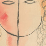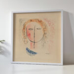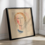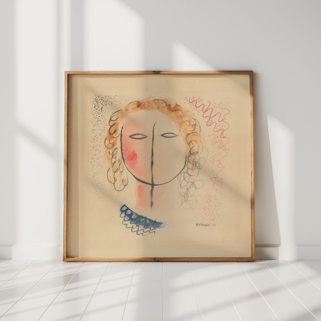 “Girl’s Head” by Mikuláš Galanda is a captivating artwork highlighting abstract portraiture. The simplistic outline of the subject’s profile is contrasted with vibrant watercolor shades and playful curls that suggest hair, inferring both form and texture. Subtle blush on the cheeks adds a humanizing touch, while geometric elements lend a modernist feel, creating a harmonious blend of simplicity and depth. This piece exudes a serene, contemplative aura with its soft color palette and graceful lines.