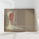 “Group of Figures” by Edwin Austin Abbey captures an intimate moment between two individuals, with a bold use of red for one figure towering over a second figure draped in yellow. They appear to interact within a sparse architectural sketch, possibly suggesting a narrative or emotional exchange. The limited color palette emphasizes the figures’ presence against the neutral background, conveying a sense of simplicity and focus on the human element.