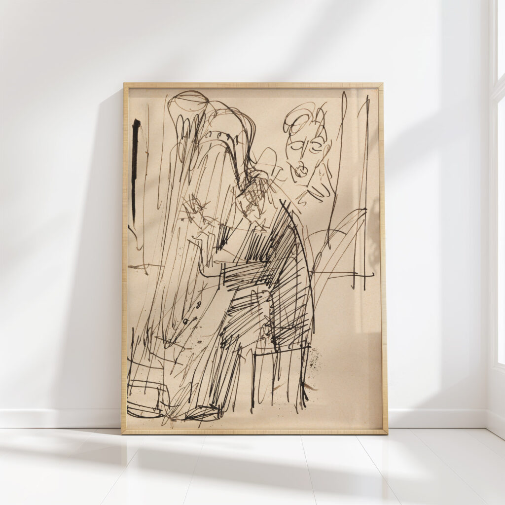 “Harfenspieler” is a compelling representation of a musician with a harp, rendered by Ernst Ludwig Kirchner. The artist employs vigorous, sketch-like strokes that convey the movement and passion of the performance. Though the details are minimal, Kirchner’s expert use of line gives a sense of the figure’s engagement with the instrument, highlighting the essence of musical expression. The artwork is distinguished by its raw energy and the emotive power that is characteristic of Kirchner’s style, emphasizing character and mood over realistic depiction.