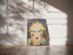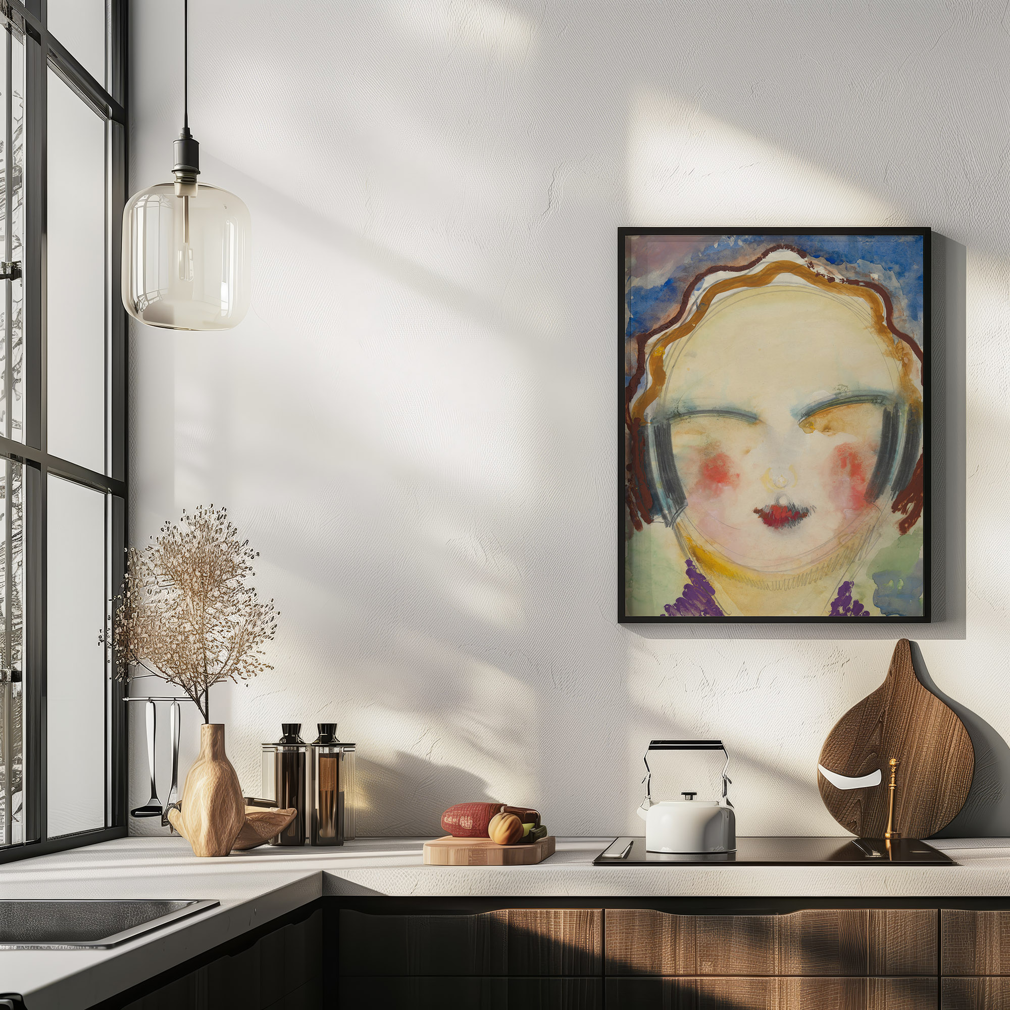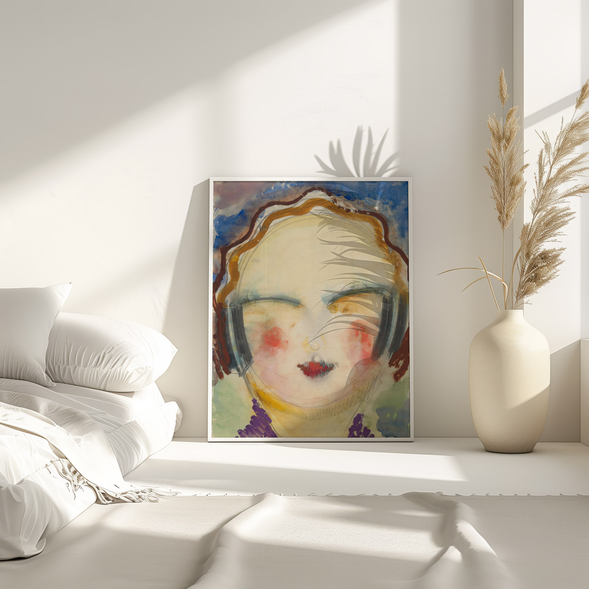 The print “Head (before 1921) – Gustaw Gwozdecki (2)” captures a head with abstract and geometric influences. Soft watercolor tones blend into each other, creating an ethereal, dreamlike visage. The central figure’s closed eyes and serene expression evoke a sense of calm introspection. Subtle flushes of color on the cheeks contrast with the muted background, enhancing the delicate nature of the piece. The head is framed by hints of clothing or perhaps hair, suggesting a portrait that hovers between representation and abstraction.