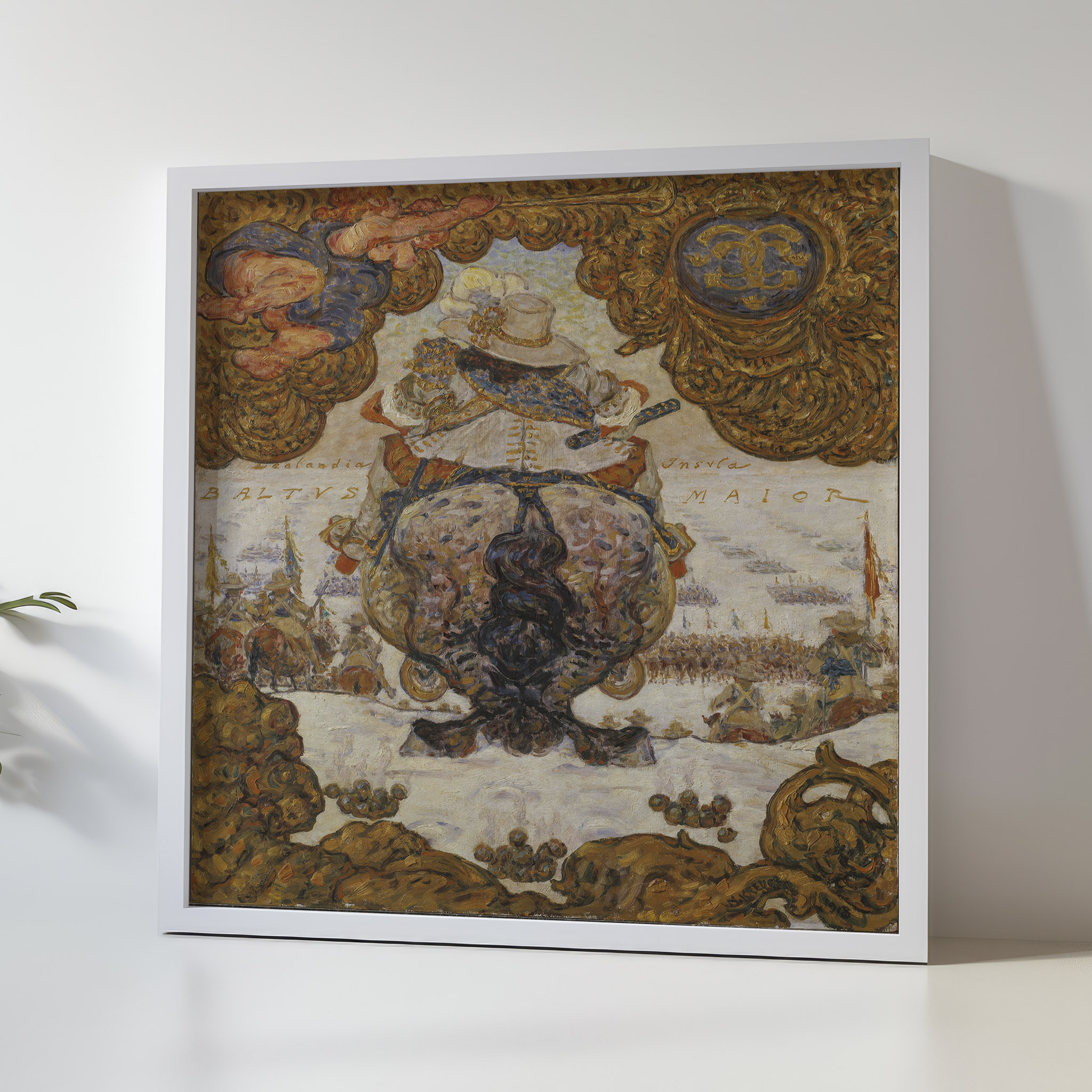 This intricate print by Nils Kreuger presents an elaborate depiction of Karl X of Sweden, viewed from behind, highlighting the majesty and historical significance of his reign. The central figure is adorned with an opulent cape, surrounded by rich ornamentation and emblems, with a battlefield in the background, implying his military prowess. Royal elements and the snowy landscape contribute to the grandiose atmosphere, suggesting power and legacy. The detailed tapestry of symbols and motifs around the figure gives depth and context, reflecting the artistic style of Kreuger and the era of Karl X.