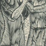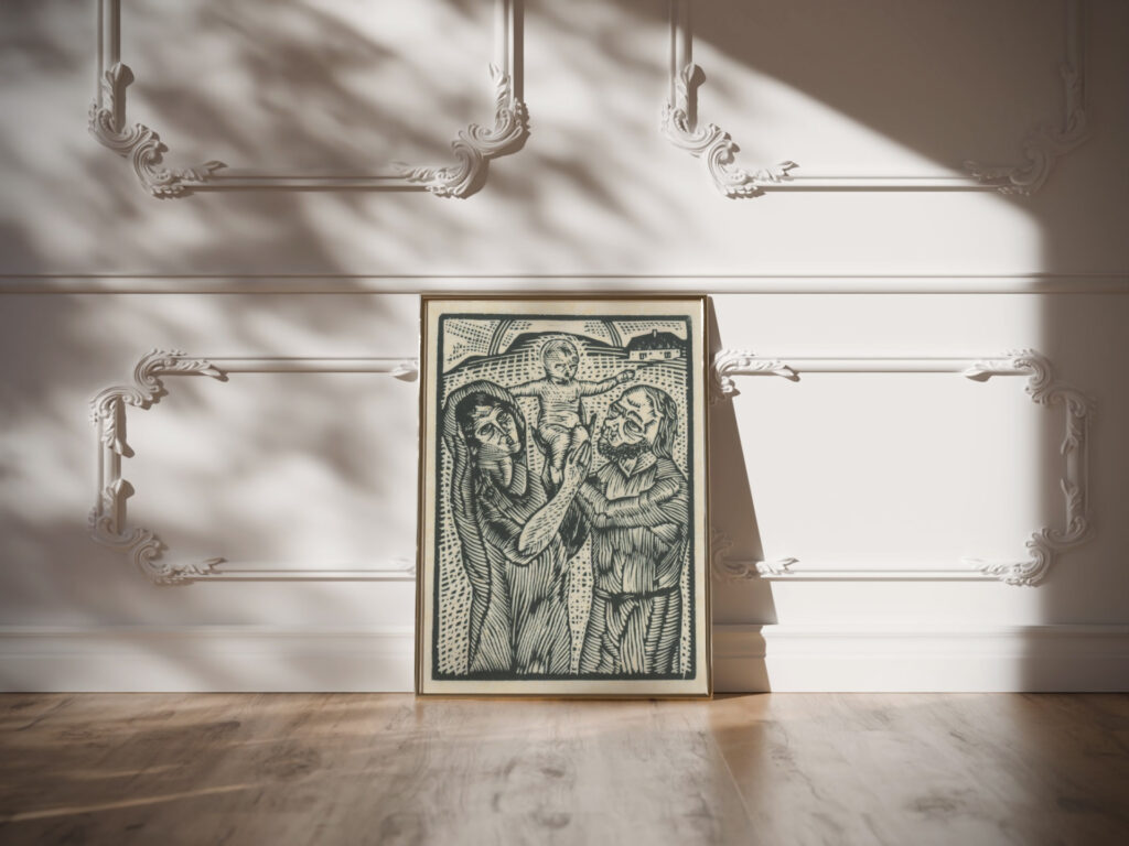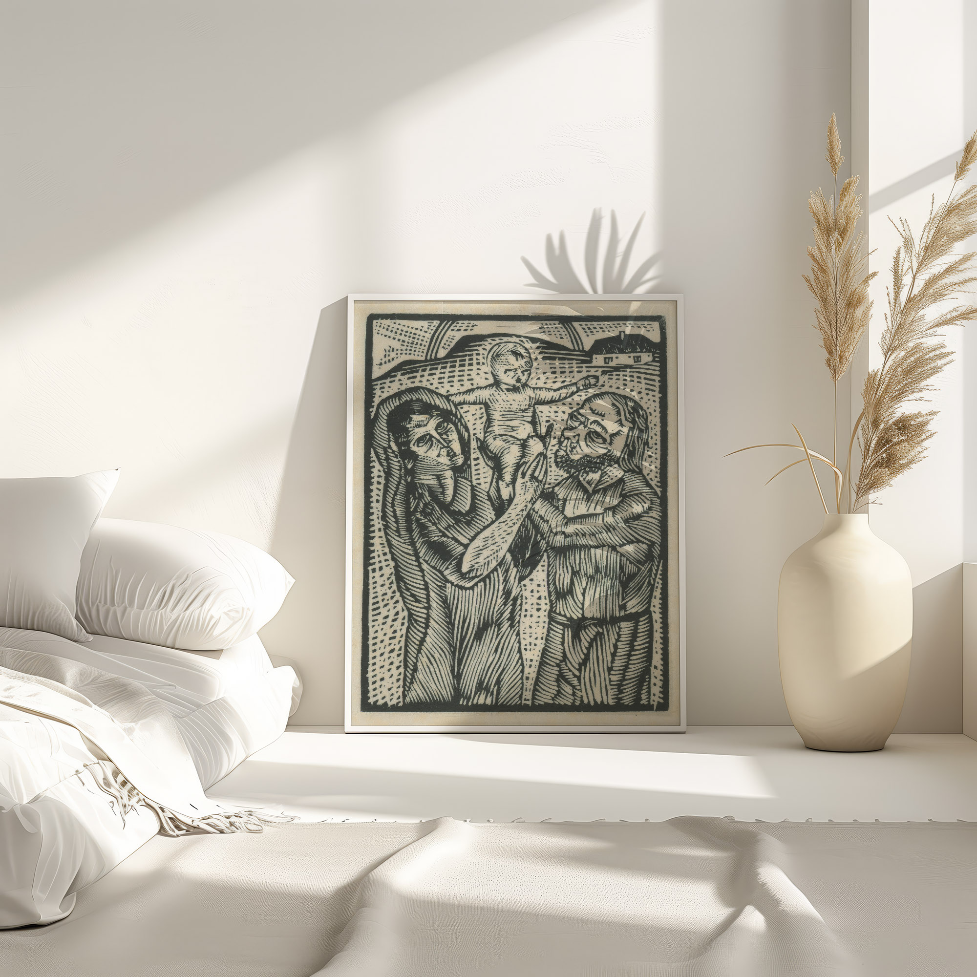 This artwork, titled “Holy family (1924),” by Mikuláš Galanda, captures a moment with three central figures in a traditional religious setting. The composition centers around the infant, held aloft by one figure, while another observes with a contemplative gaze. Expressive linework conveys texture and emotion, creating a sense of depth and movement within the static image. The background suggests a humble setting, adding to the print’s portrayal of a serene, yet poignant familial scene.