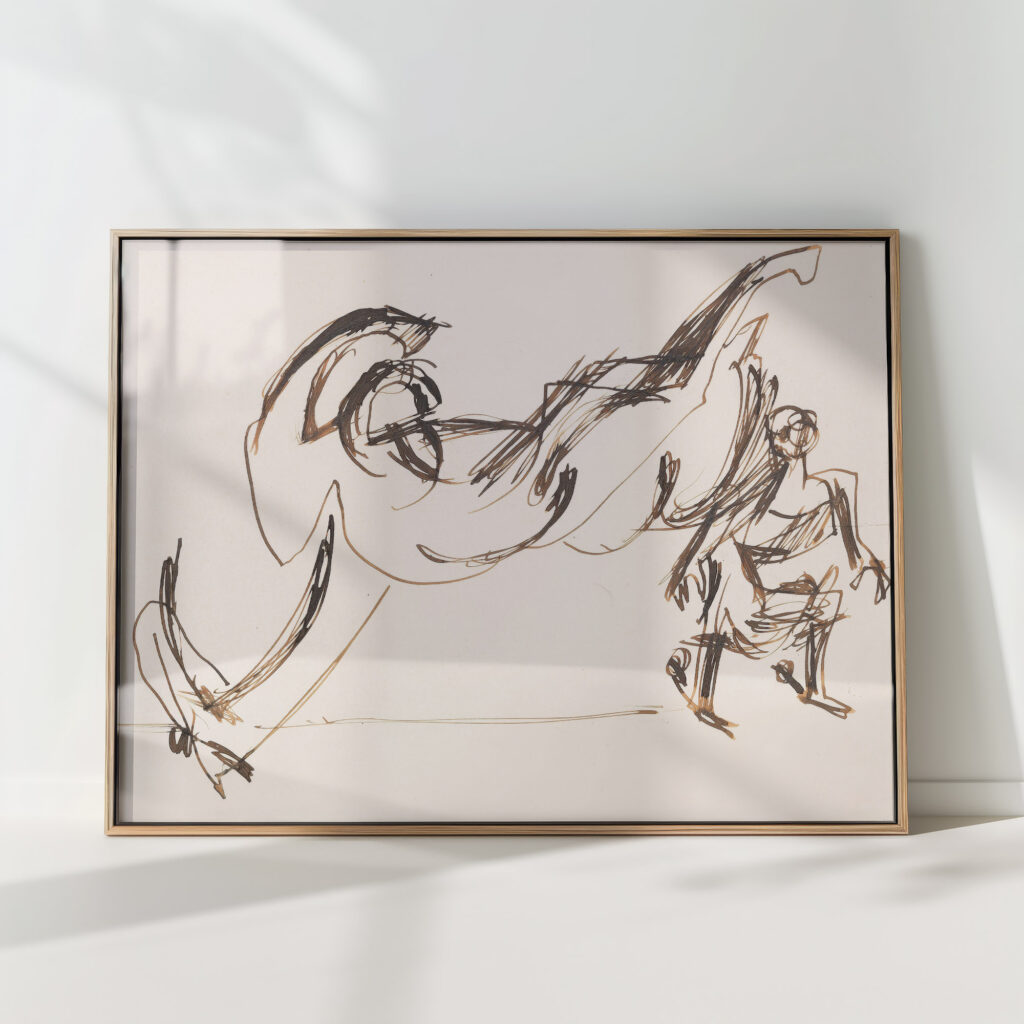 Ernst Ludwig Kirchner’s work depicts an intense moment between a rider and her toppled horse. The print captures the immediacy of action using swift, bold strokes that convey the dynamic interaction and express the physical and emotional experience of the subjects. The sketched lines emphasize a narrative of motion, impact, and perhaps the relationship between human and animal.
