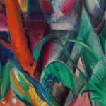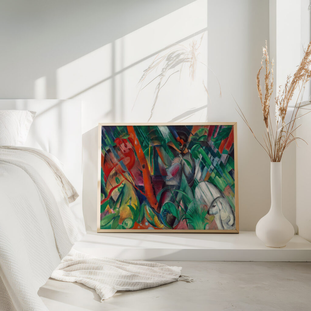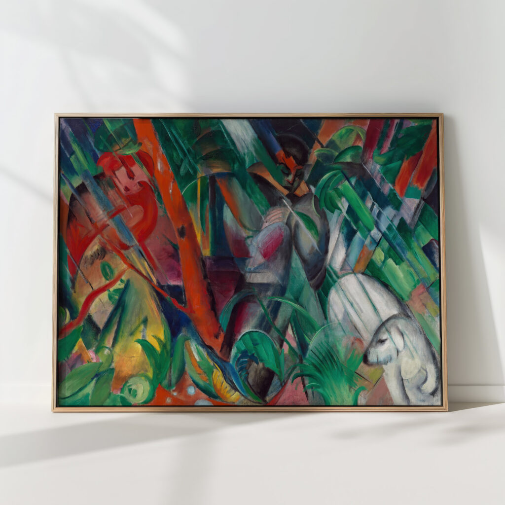 “In the Rain” by Franz Marc exhibits a rich tapestry of vivid hues and interlocking shapes that create a sense of depth and texture. This print captures a harmonious blend of the natural world with abstract elements, featuring animal silhouettes and lush foliage intertwined. The composition conveys a lively dance of color and form, creating an immersive visual experience that resonates with energy and natural rhythms.