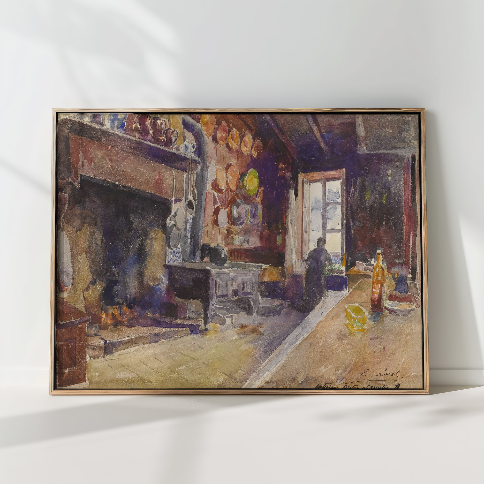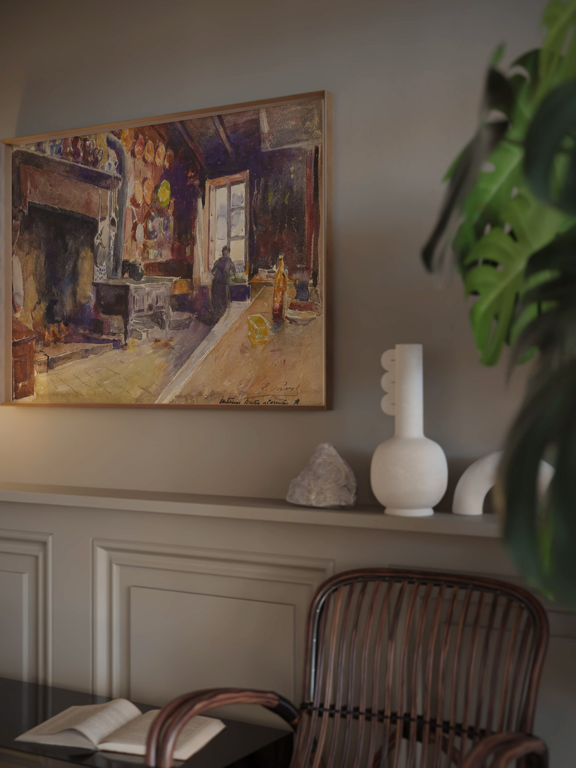 The image by Elie Anatole Pavis showcases an indoor setting, capturing the serene ambiance of a well-lit room. The composition draws attention to the depth of space, characterized by furnishings and decor, while a solitary figure adds a human element to the domestic scene. The play of light and shadow creates a warm atmosphere, inviting contemplation of the peaceful interior.