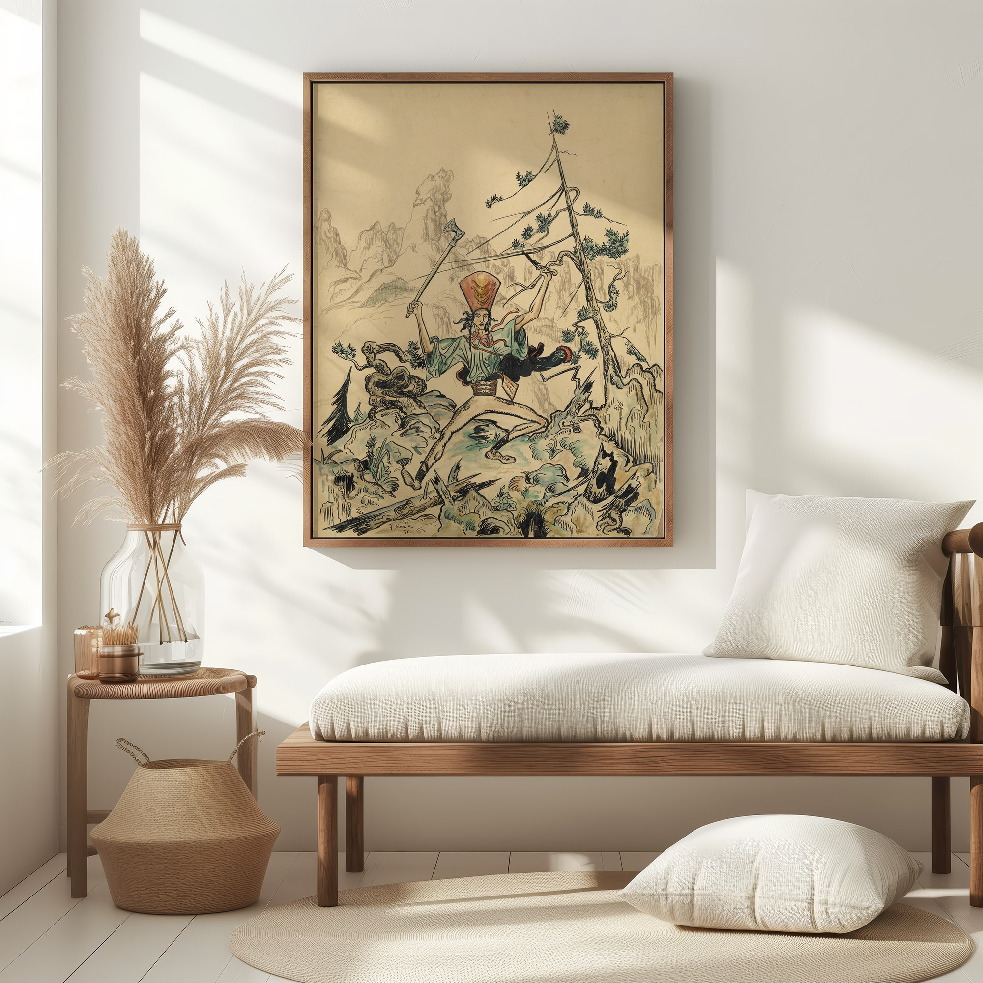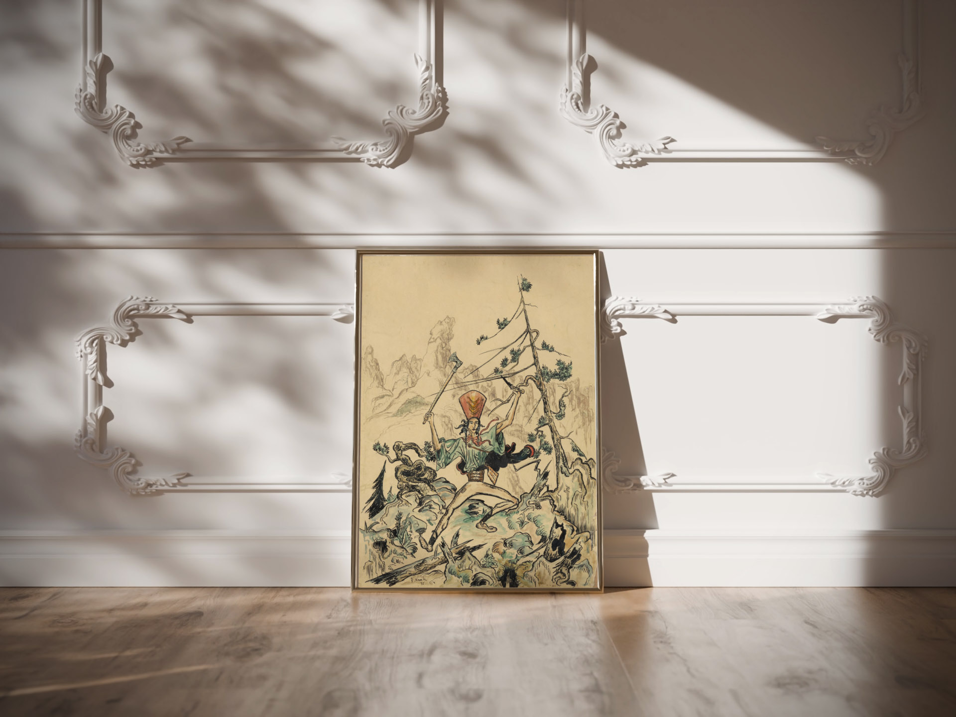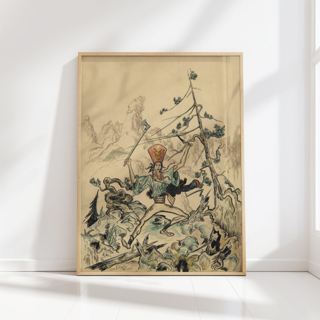 The print “Jánošík – Ján Novák” features a central character in ornate clothing, confidently navigating a rugged terrain. A sense of victorious stride is conveyed as he holds a flag aloft with one hand. His other hand wields a weapon, reinforcing his readiness for challenge or combat. The background consists of a detailed natural landscape, with striking mountain peaks and verdant trees adding depth and character to the scene. A mythic beast accompanies the figure, suggesting an element of fantasy or folklore embedded in the narrative of the artwork. The composition of the print communicates a narrative of adventure, strength, and the triumph of the human spirit.