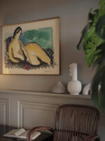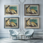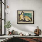 Mikuláš Galanda’s “Lying nude” features an elegantly simplified depiction of a reclining female form. The figure is composed of warm, beige and brown hues that convey the softness of the human body. Her pose is both languid and serene, suggesting a moment of quiet repose. Galanda’s use of fluid lines and minimalistic detail focuses on the essence of the figure, while a backdrop of green and blue adds a cooling contrast to the composition, creating a harmonious balance of color and form. The relaxed posture and the overall tranquility of the scene evoke a sense of timeless beauty and calm.