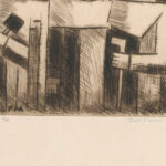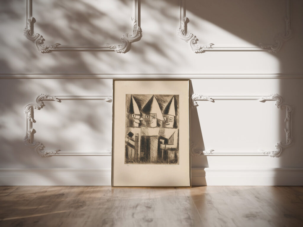“Masks” by Tadeusz Makowski presents a trio of figures with sharply defined geometric masks. Their elongated, conical hats and the interplay of light and shadow create an abstract composition. Each figure appears to be holding an object, contributing to a sense of narrative or ritual within the abstract depiction. The artwork conveys a structured yet enigmatic atmosphere through its use of stark lines and monochromatic palette.