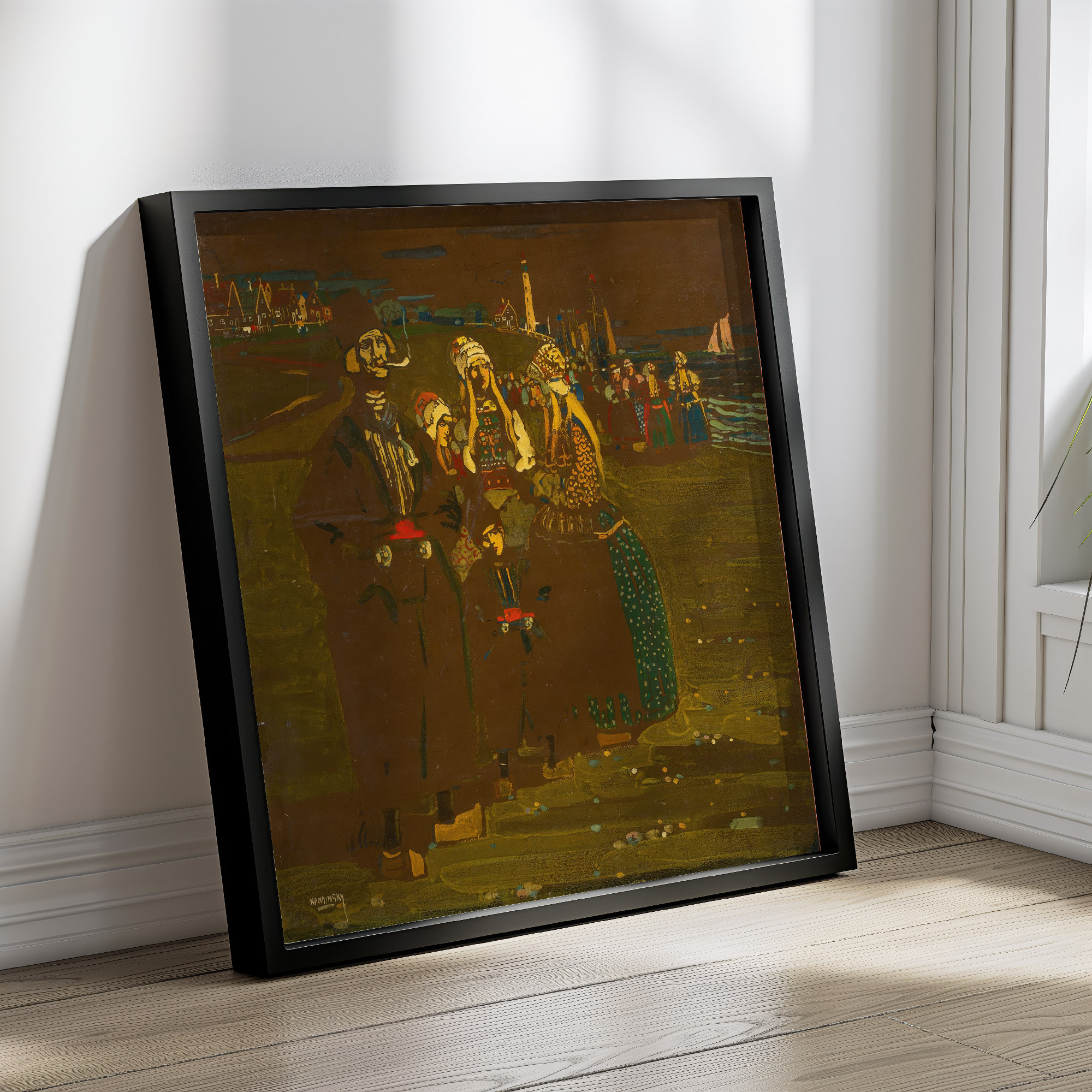 This artwork by Wassily Kandinsky presents a group of figures against a rich, marine backdrop. Dominated by earthy hues and pops of red, the scene conveys the weight of expectation as individuals await the return of ships. The stylization reflects Kandinsky’s distinctive approach to form and color, while the composition captures the intersection of human activity and the maritime environment, evoking a narrative steeped in cultural identity and emotional resonance.