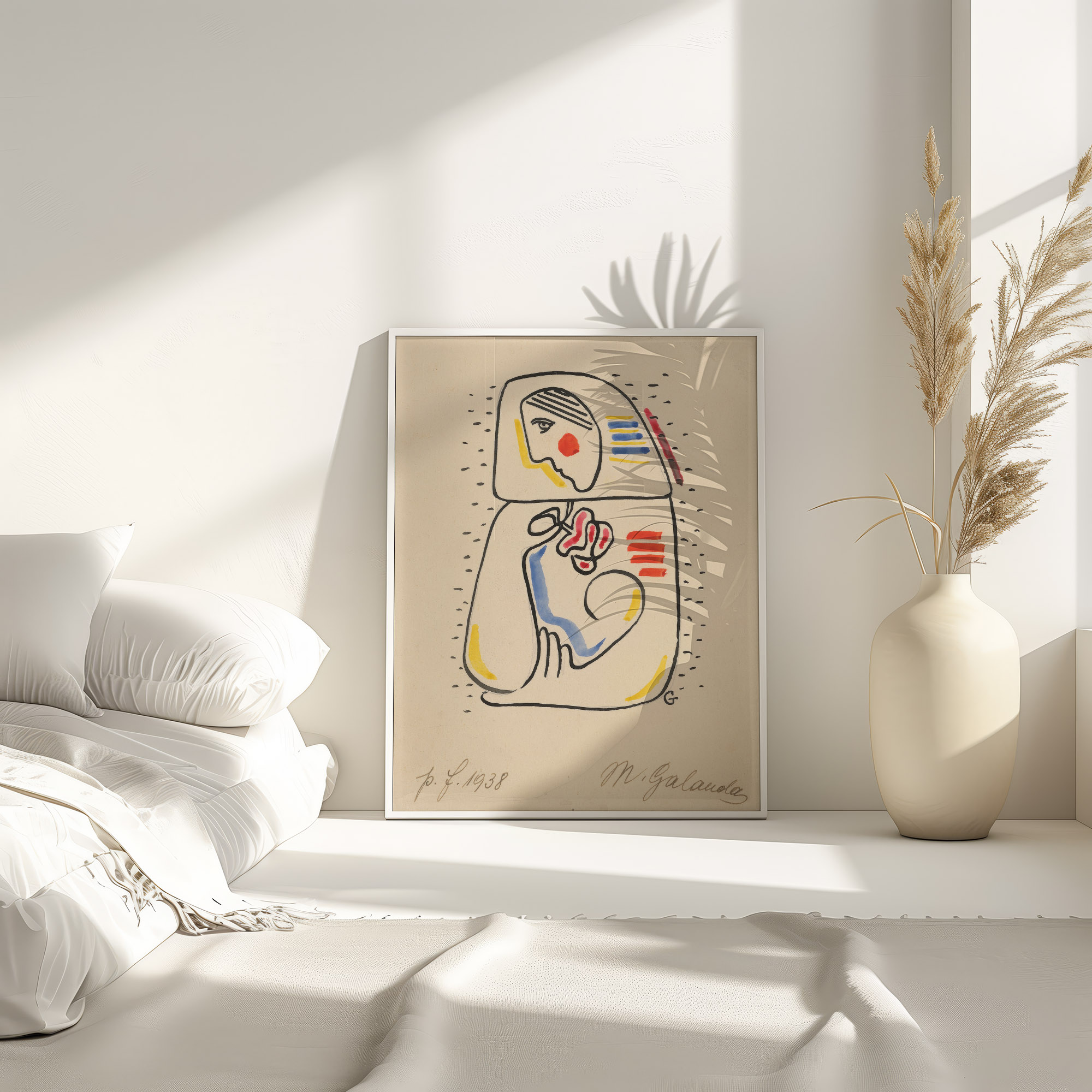 The “Matka” print by Mikuláš Galanda displays a modernist rendition of a maternal figure, characterized by its simplified forms and a harmonious palette of primary colors. The abstract representation captures the essence of motherhood through minimalistic shapes and lines, evoking emotion and depth despite the apparent simplicity. The use of color and form creates a sense of tenderness and connectivity within the composition.