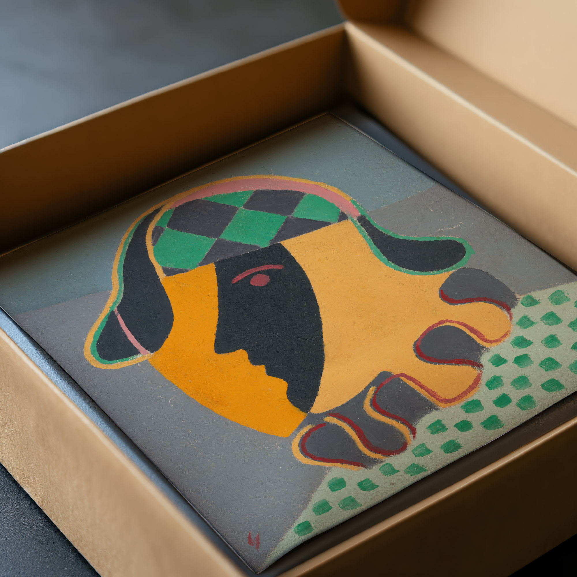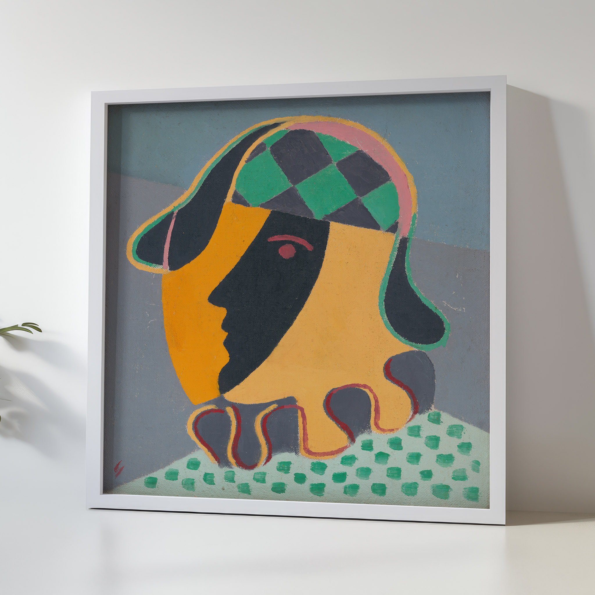 “Pierot’s Head (1932) – Mikuláš Galanda” showcases an abstract profile view of a character, characterized by bold, flat areas of color and geometric patterns. The checkered hat adorning the character’s head adds a playful and graphic element to the composition. The use of shadows and silhouette gives depth to the flat color treatment, while the artwork maintains a strong sense of modern, minimalist aesthetics. This print is a clear representation of modern art’s embrace of abstraction and stylization, utilizing shapes and colors to convey its subject.