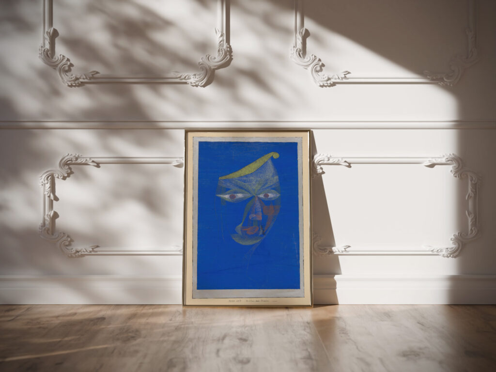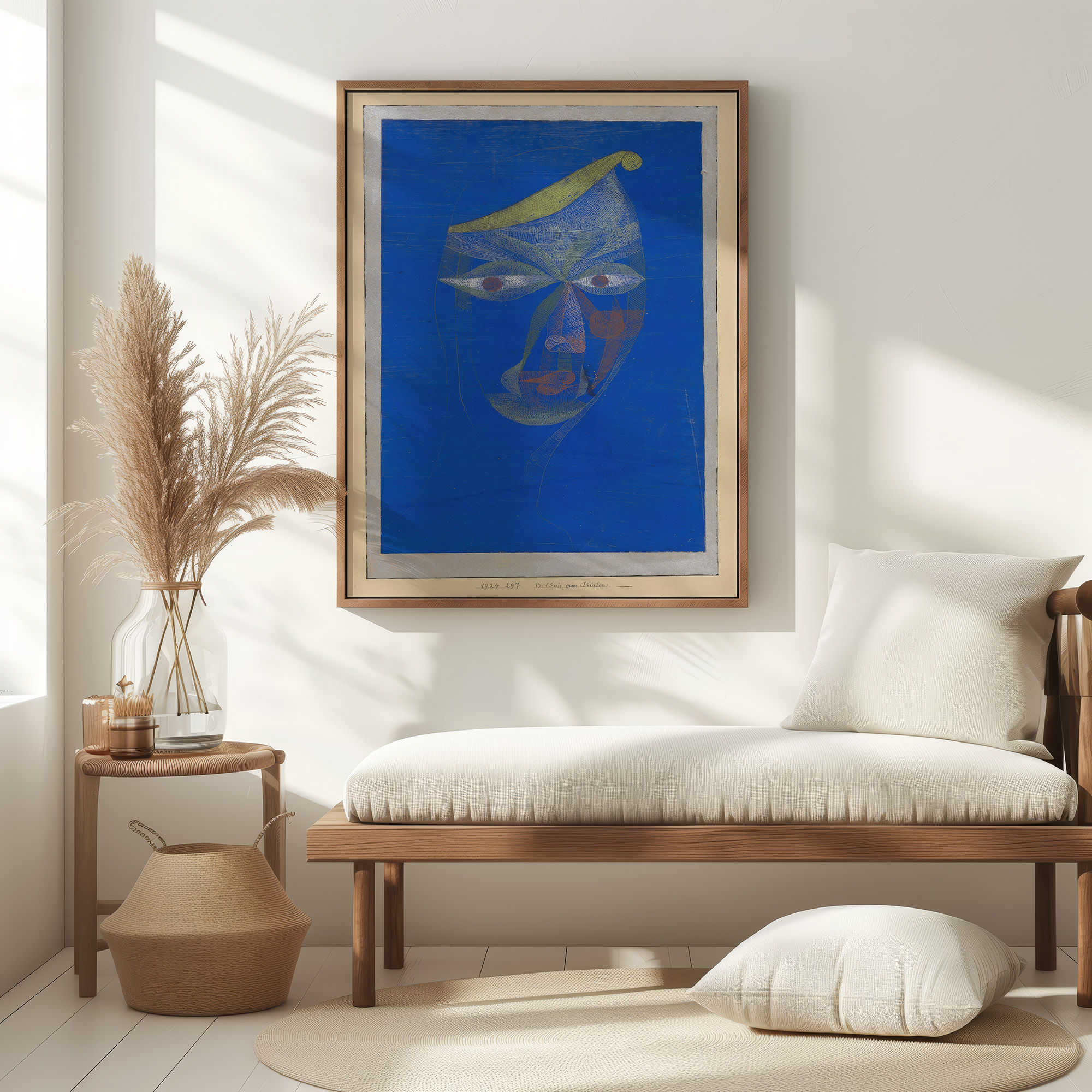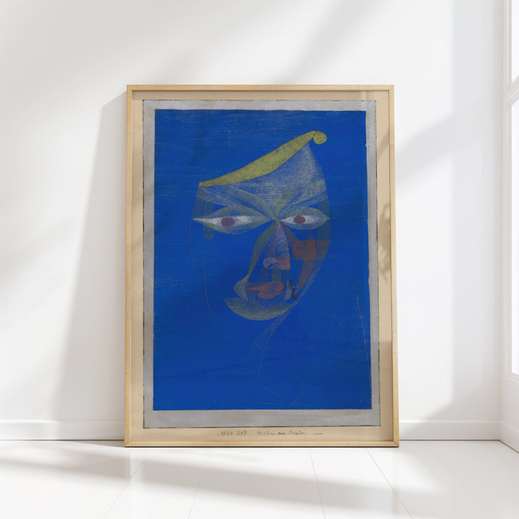 The print by Paul Klee, titled “Bildnis eines Asiaten,” showcases a striking abstract portrait with a blend of geometric shapes and vibrant colors. Dominated by a rich blue background, the facial features are depicted through an overlay of transparent forms in contrasting hues, creating a layered effect. Subtle green highlights contour the face, enhancing its depth and complexity. This artwork captures the essence of Klee’s unique style, which mixes abstract art with elements of expressionism and surrealism.