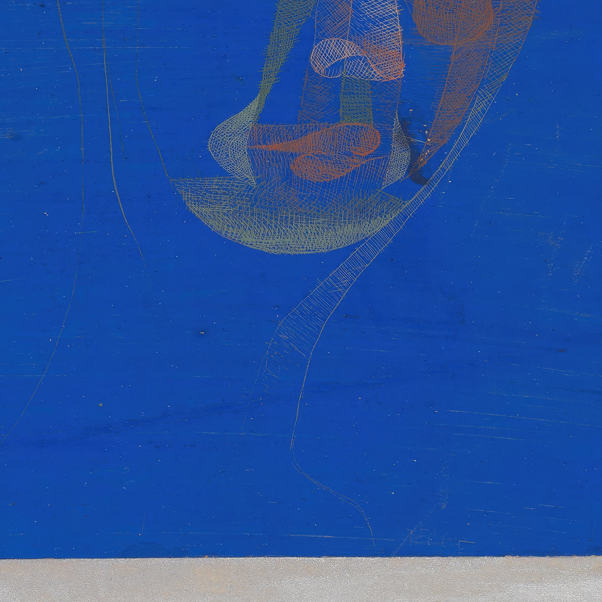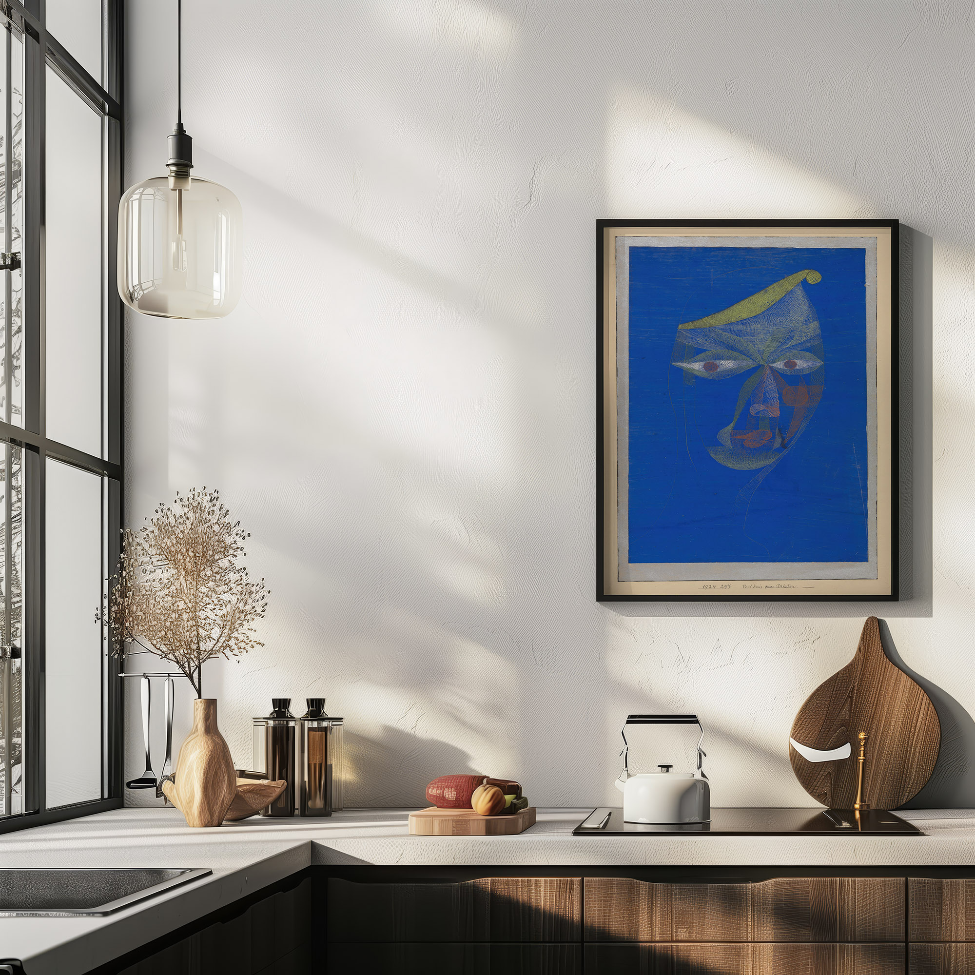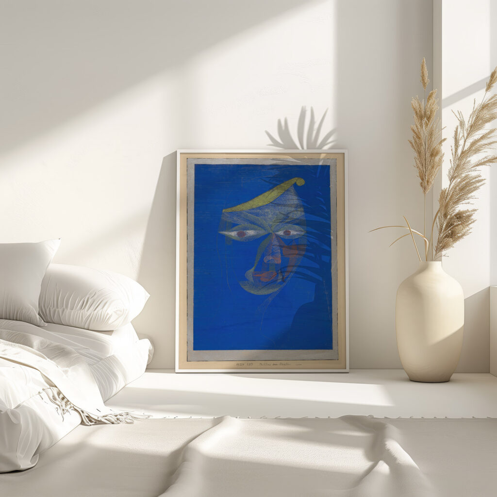 The print by Paul Klee, titled “Bildnis eines Asiaten,” showcases a striking abstract portrait with a blend of geometric shapes and vibrant colors. Dominated by a rich blue background, the facial features are depicted through an overlay of transparent forms in contrasting hues, creating a layered effect. Subtle green highlights contour the face, enhancing its depth and complexity. This artwork captures the essence of Klee’s unique style, which mixes abstract art with elements of expressionism and surrealism.