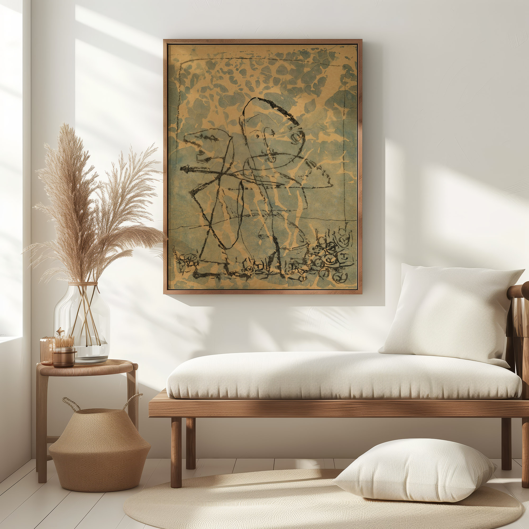 The “Public Duel” print by Paul Klee showcases an abstract composition with a dominant figure formed by intersecting lines and geometric entities. The background is intricate, with a mottled texture and a warm tone that varies across the print. There’s a sense of movement and fluidity within the central figure, evoking a sense of conflict or interaction. Despite the abstract nature, small elements at the bottom may suggest an audience or additional figures, adding depth to the scene. The use of line and form creates a compelling narrative that leaves much to interpretation.