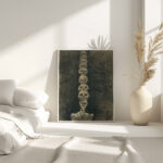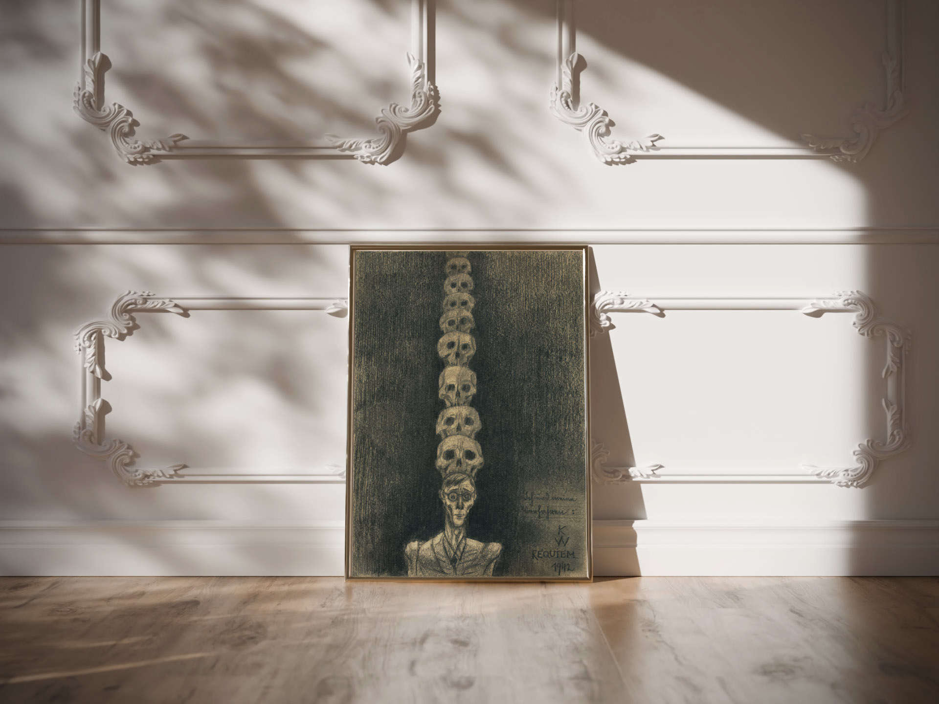 “Requiem” by Karl Wiener presents a haunting visual metaphor with a series of human skulls stacked to form the elongated neck of a central figure, who appears contemplative or resigned. The eerie atmosphere is enhanced by the monochromatic palette and textured shading, which emphasize the macabre and thought-provoking quality of the artwork. This striking print invites reflections on death, humanity, and the existential journey of the soul.