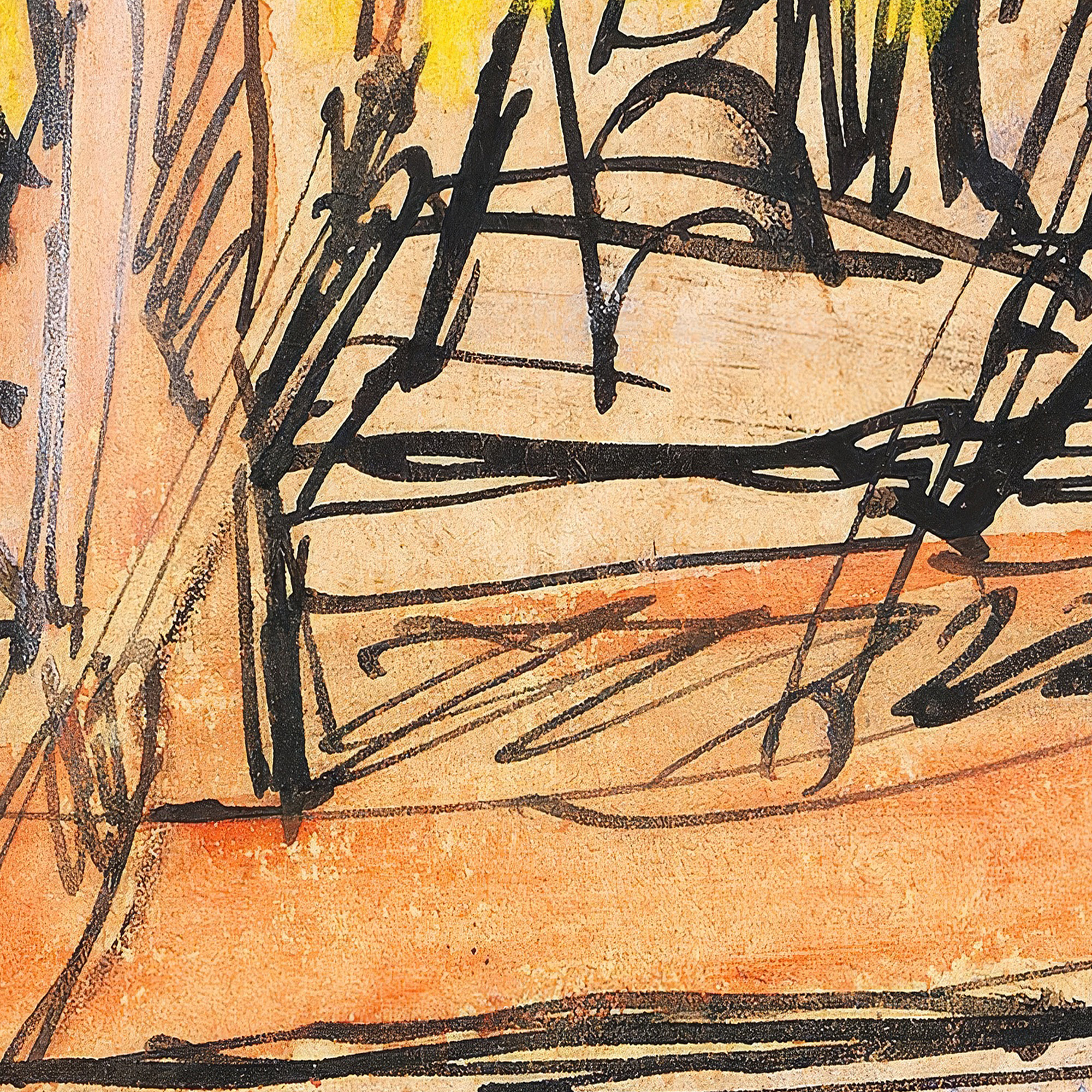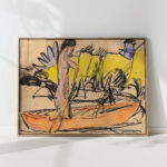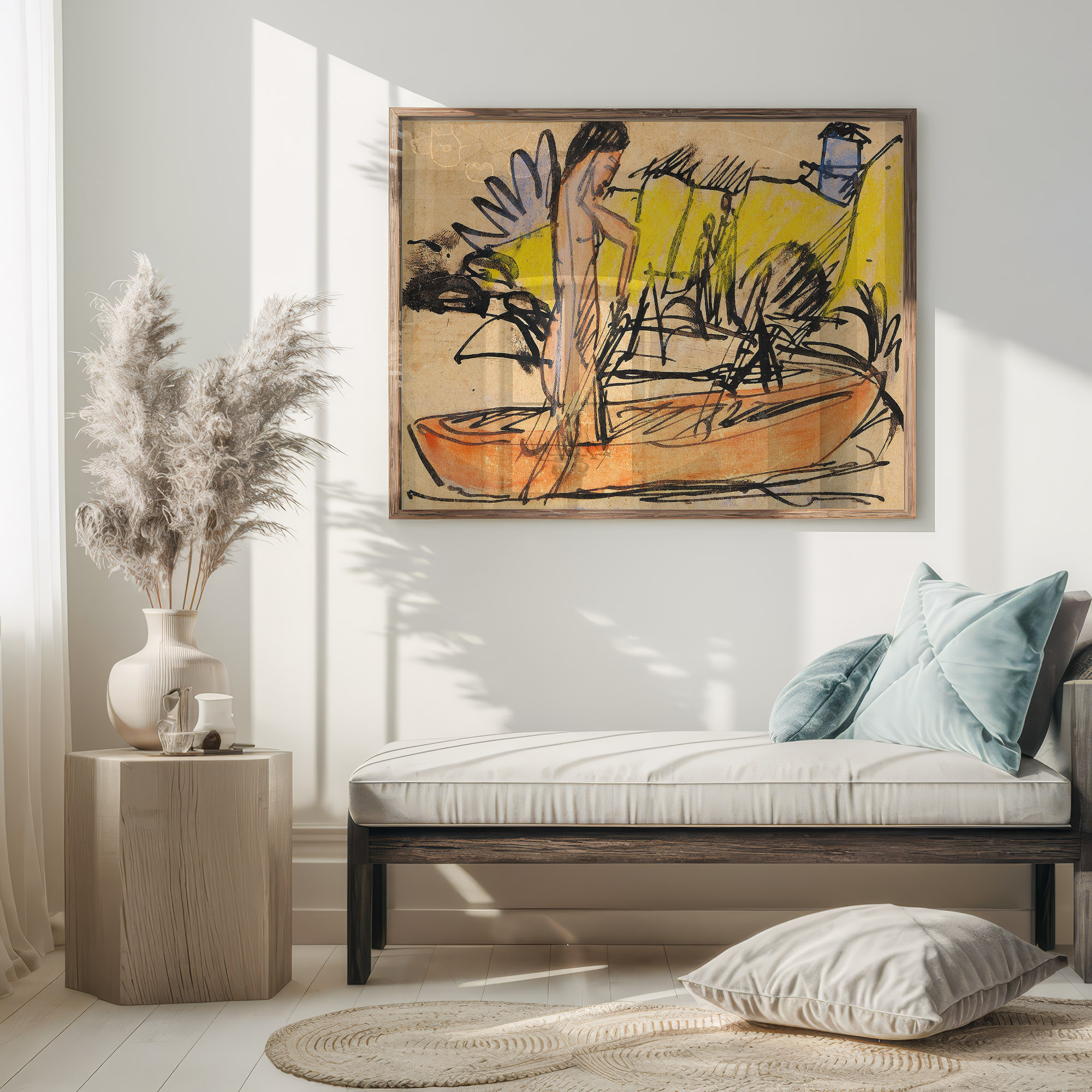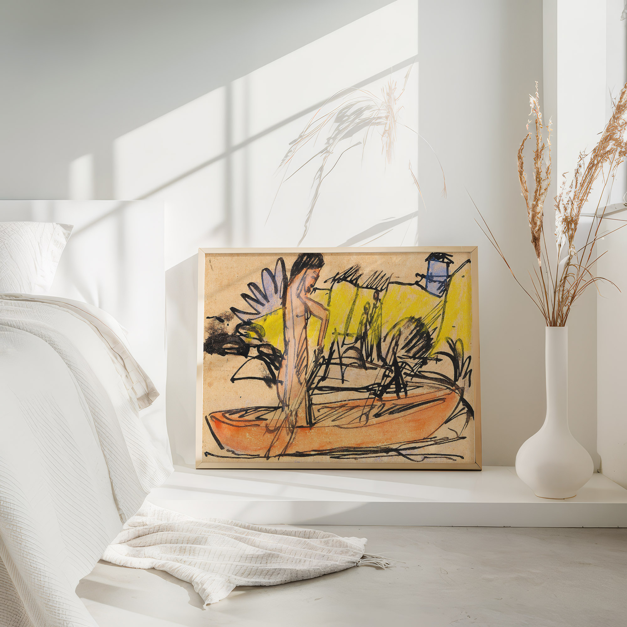 “Rudernder Akt” by Ernst Ludwig Kirchner exhibits an avant-garde approach with its abstract geometric elements and stark color contrasts. A nude rower is central, captured in the fluid action of rowing, showcasing Kirchner’s expressionistic style. Simplified forms and dynamic lines evoke a sense of raw energy and primitive vitality, placing the human figure in harmonious connection with the rhythmic flow of nature and activity.