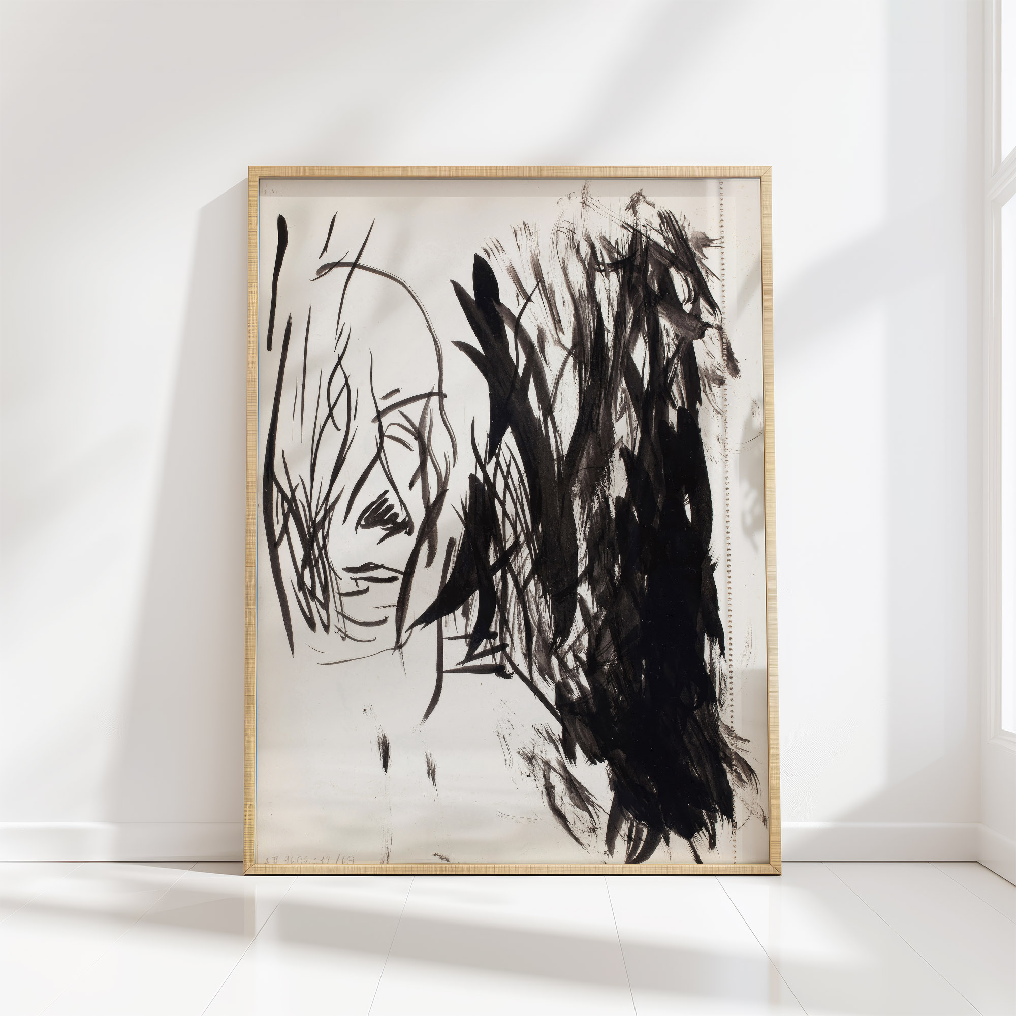 This print, “Luonnos (1905) – Magnus Enckell,” captures the interplay of shadow and light through bold, gestural strokes. The chaotic yet harmonious black lines suggest movement and emotion, evoking an impression of figures emerging from the abstract forms. The minimalistic approach, using a monochrome color scheme, creates a sense of depth and texture, engaging the viewer in the complexity of its composition and leaves space for personal interpretation.