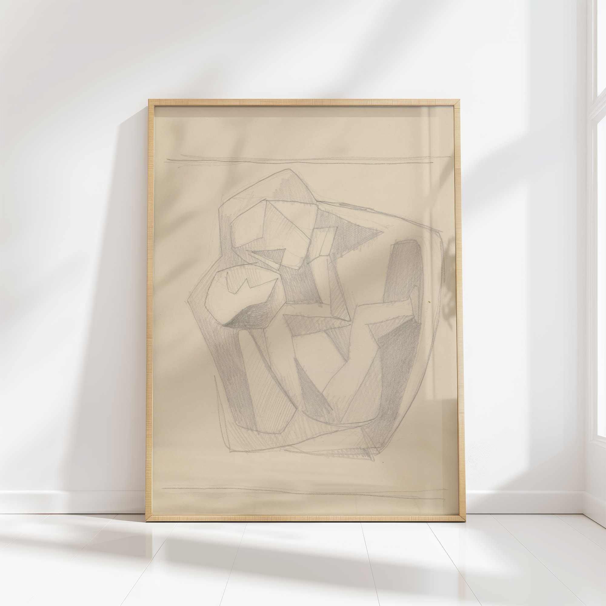 The print “Skicár s rôznymi štúdijnými kresbami IV” by Mikuláš Galanda displays a captivating composition of abstract forms. Pencil lines intersect and overlap to create a sense of depth and structure, hinting at cubist tendencies. The artwork evokes a study of shapes and their relationships within a confined space, enabling viewers to ponder the balance between fragmentation and harmony in the realm of abstract art.