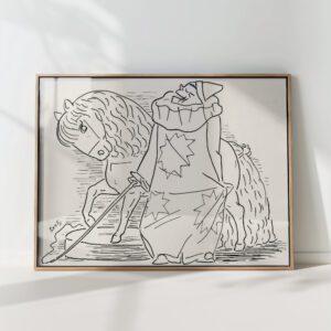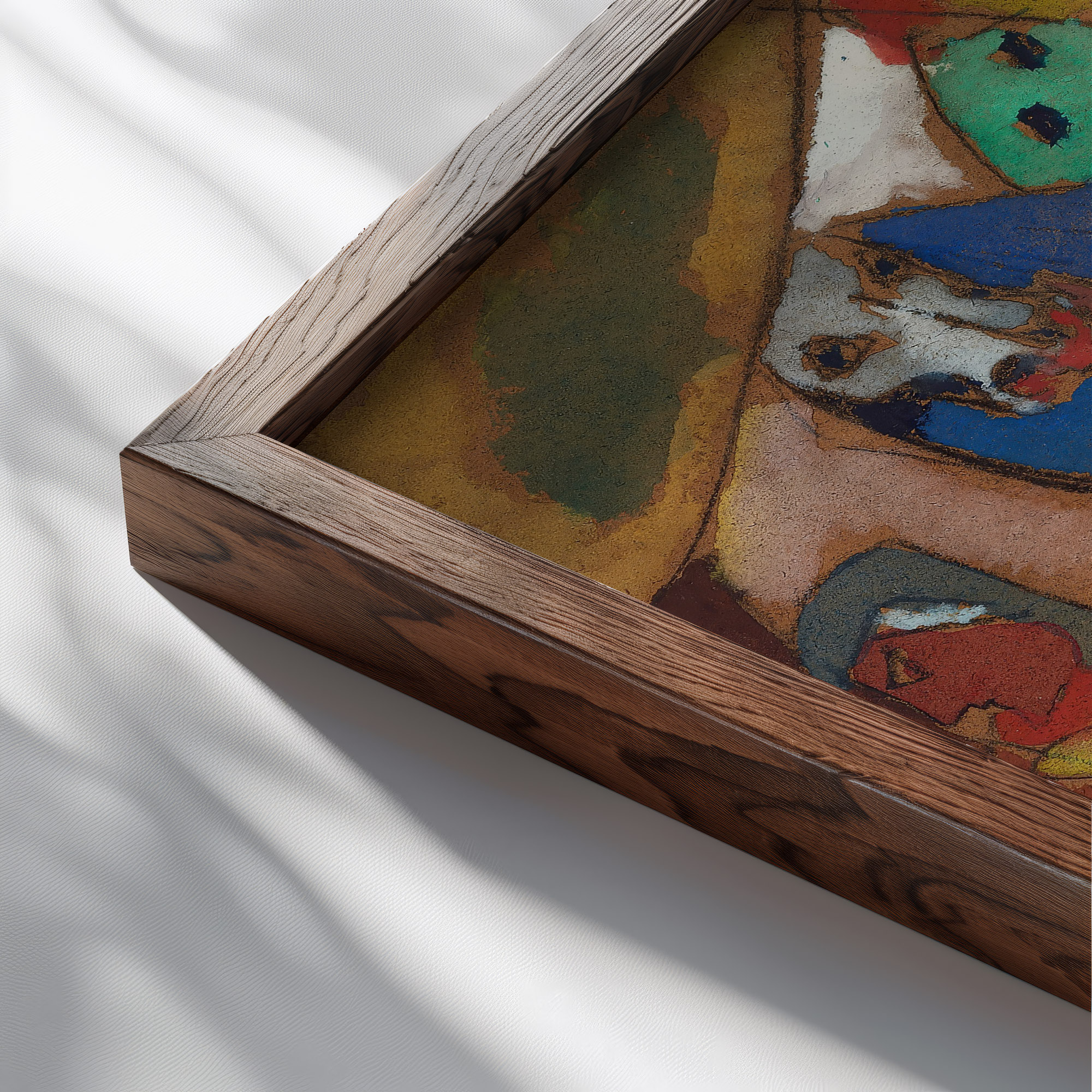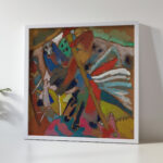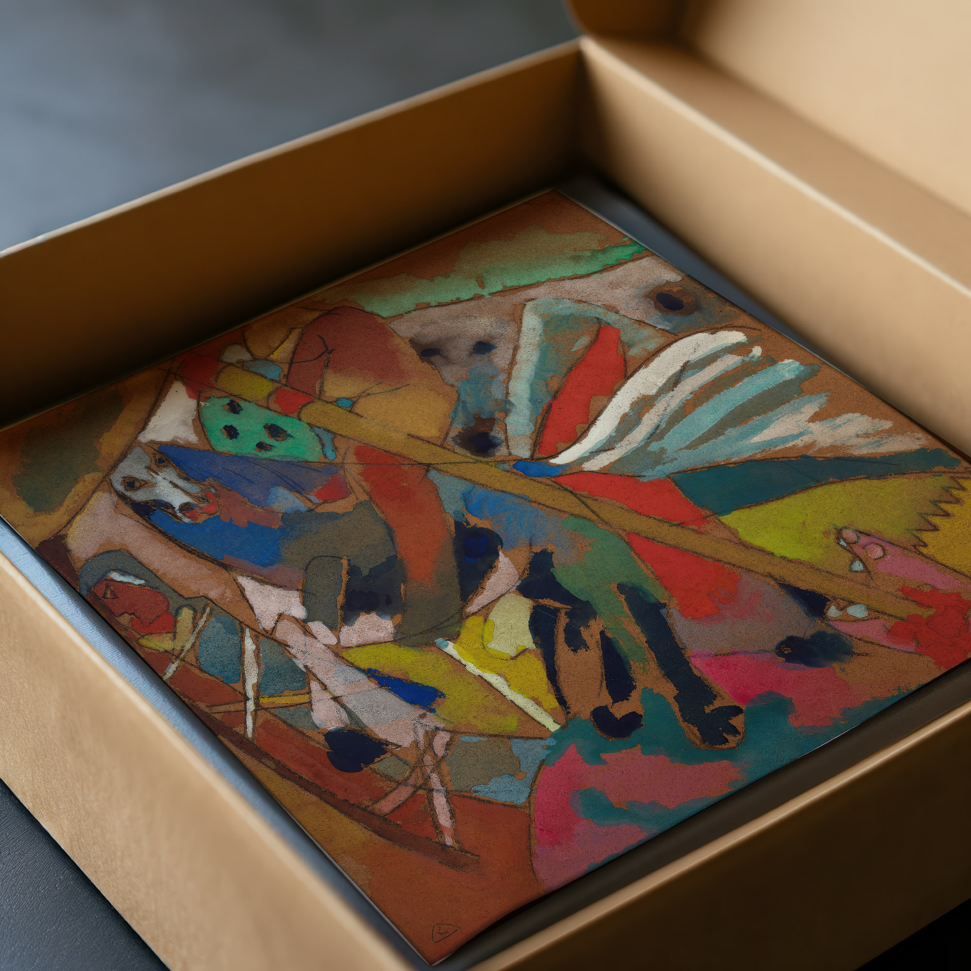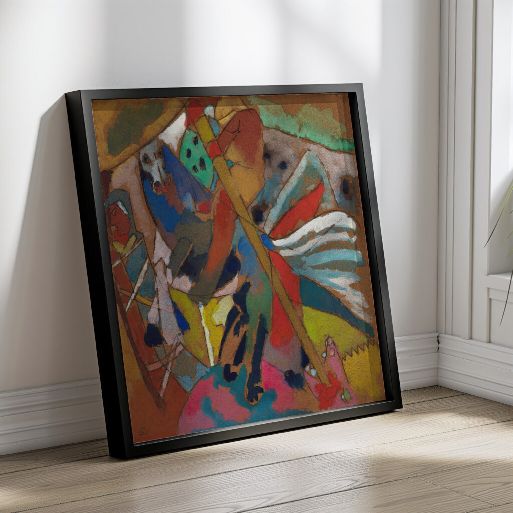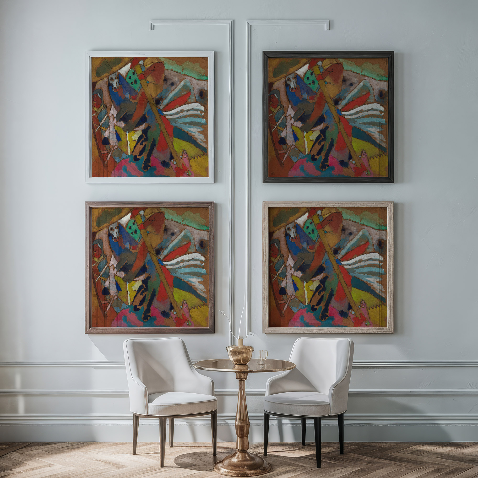 In the print “St. George II” by Wassily Kandinsky, a flurry of abstract forms and intense colors collide, creating a sense of motion and emotion. Though the figure of St. George is not directly discernible, the print evokes the essence of the myth through its dynamic composition, with intermingling shapes and a palette that ranges from deep blues and red to lighter hues, resulting in a powerful visual narrative. The artwork exudes a spiritual atmosphere, with a modern twist on religious iconography.