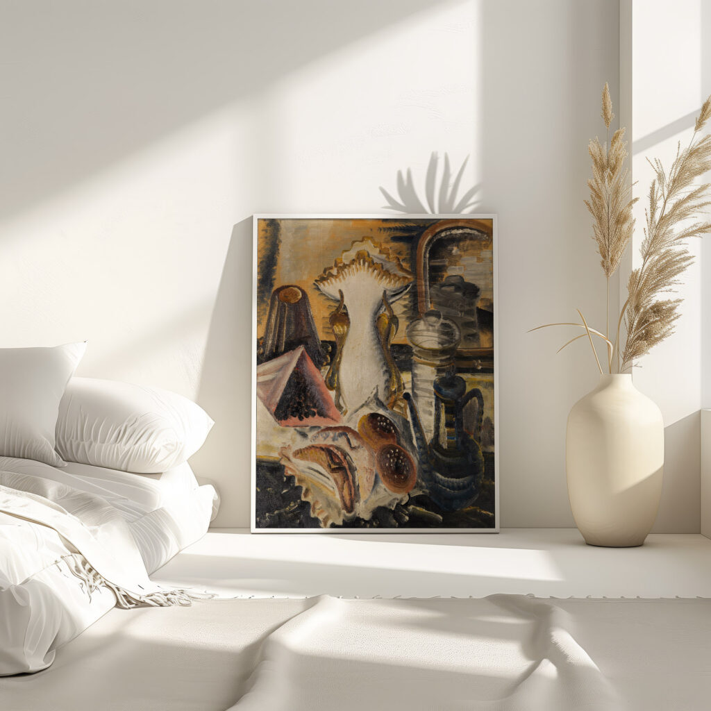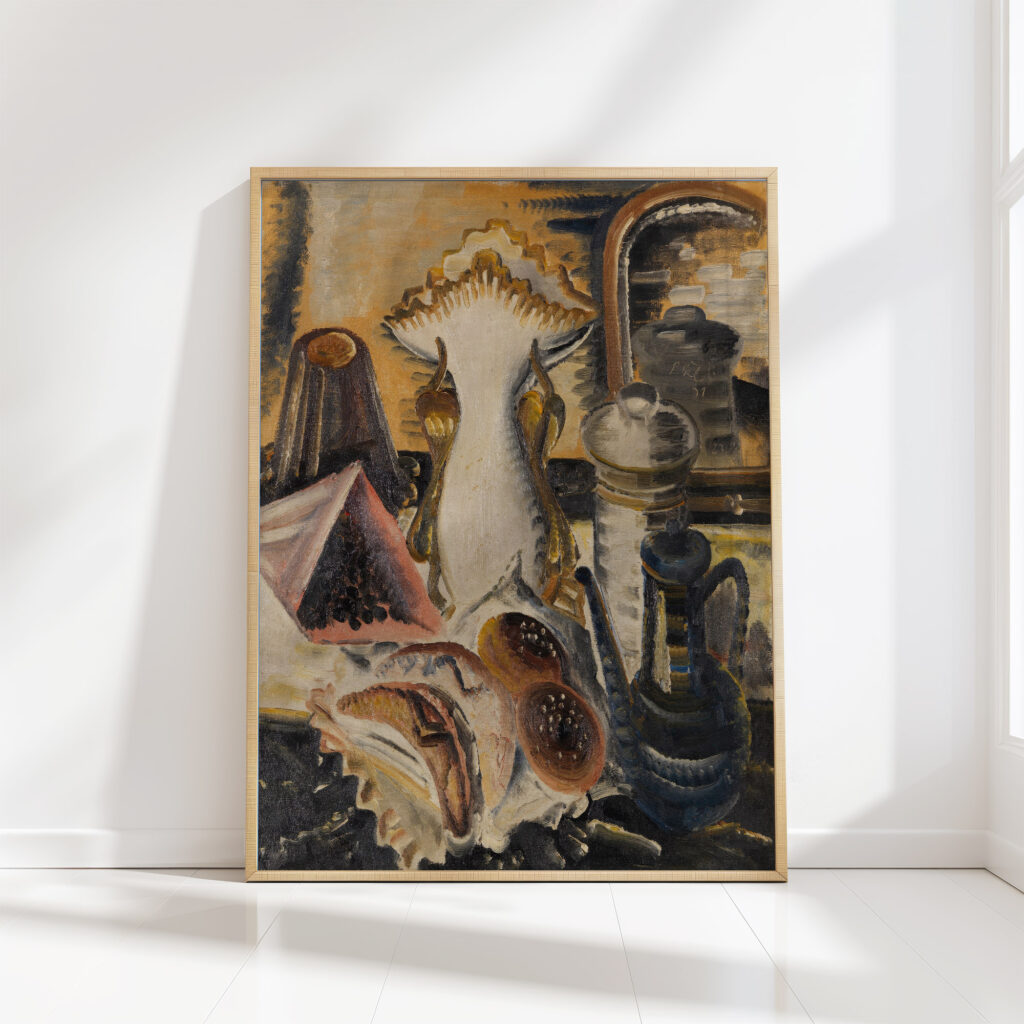 This print showcases a vibrant still life arrangement with a central coffee pot, surrounded by dried currants and fresh fruit. Rich in texture, the scene is composed with an intricate play of light and shadow, emphasizing the contrast and harmony between the objects. The detailed rendering of the fruit’s surfaces and the coffee pot’s reflective material creates a dynamic interplay of shapes and colors. This work is a testament to the meticulous attention to capturing everyday objects with artistic sensitivity.