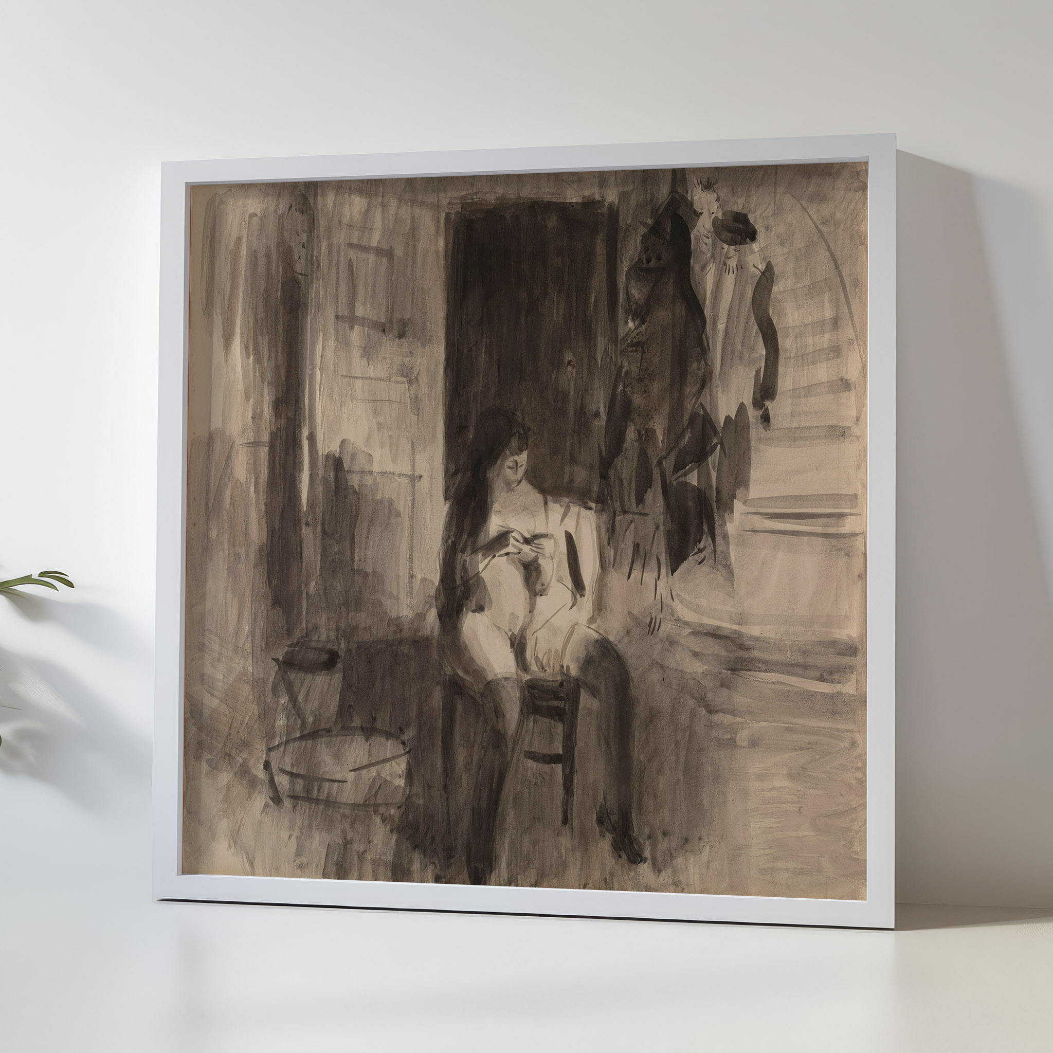 “Susanna and the Elders (1910)” by Rik Wouters depicts an intimate and evocative scene derived from a biblical narrative. The central female character, Susanna, is seated and engrossed in her activity, seemingly unaware of the two male figures looming over her. The interaction suggests tension and the possibility of an unfolding story. The artwork, with its soft brushwork and subdued tones, captures a moment steeped in emotion and cultural significance.