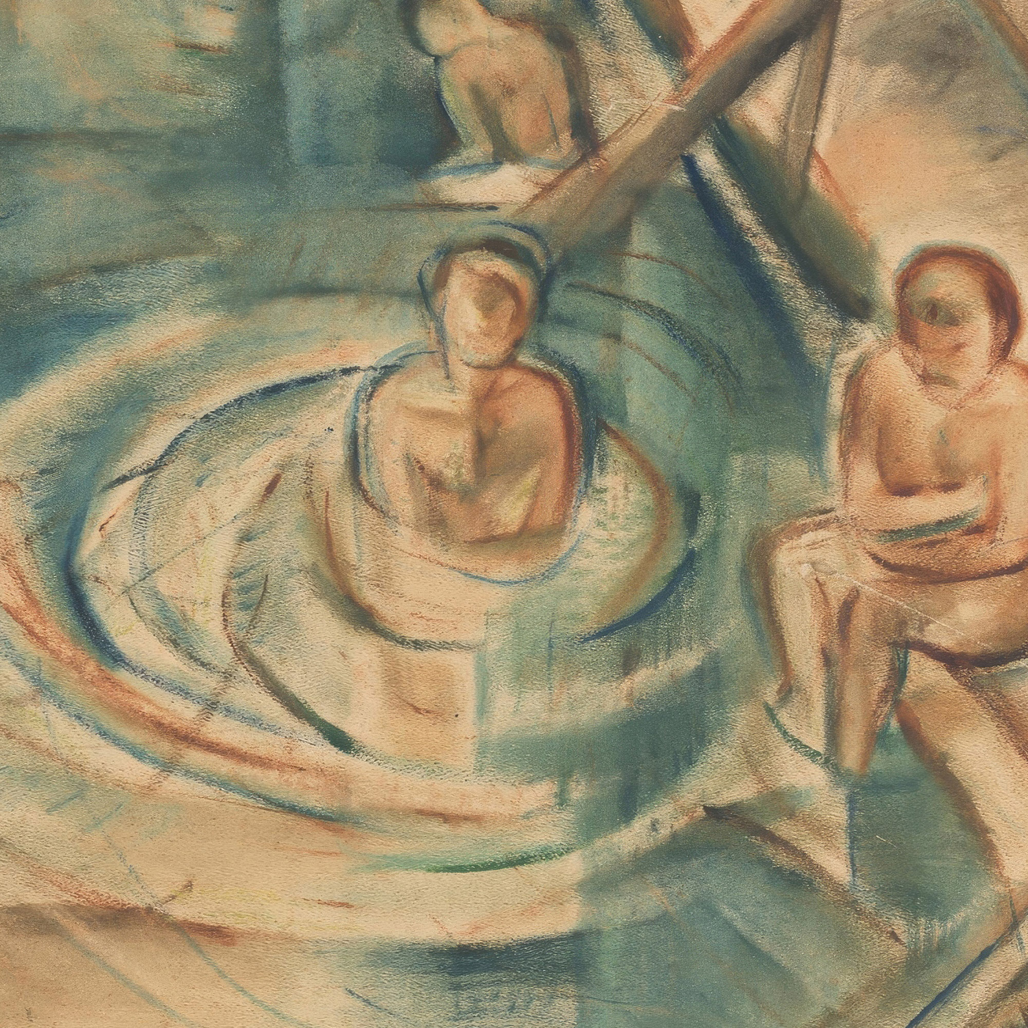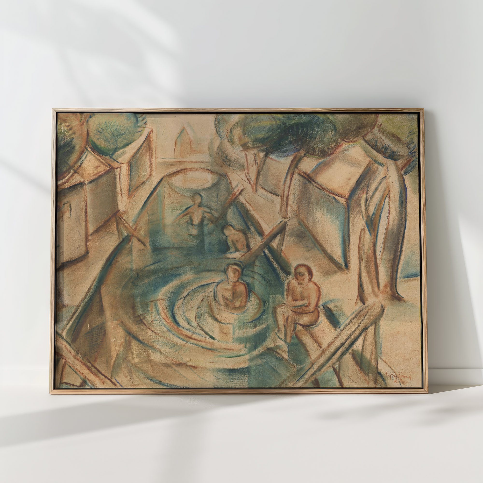 József Egry’s “Kúpalisko v Hévízi” portrays a group of individuals relaxing in what appears to be a spa or bathing facility. The circular pattern of the pool suggests movement and fluidity, while the earthy tones and gentle brushstrokes give the scene a dreamy quality. The subjects are depicted engaging with the water and each other, resting along the poolside and in the water, exuding a sense of leisure and repose. The artwork captures a snapshot of quietude away from the bustling modern life, inviting viewers to reflect on moments of simple pleasure and calm.