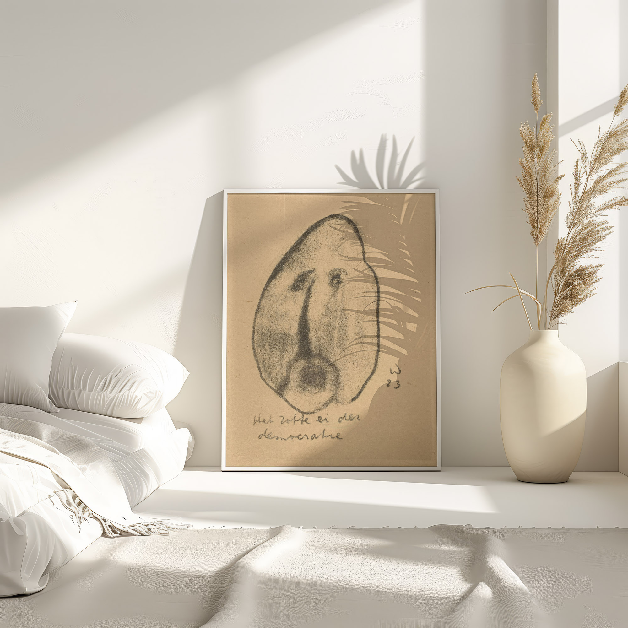 “Het zotte ei der democratie” by Erich Wichmann is a thought-provoking image featuring a simplistic yet expressive character. The artwork shows a sketched face inscribed in an egg-shaped contour, seemingly conveying a jest about the state of democracy with a minimalist approach. The marked facial features offer a piercing look that engages viewers in a dialogue about representation and political commentary.