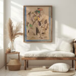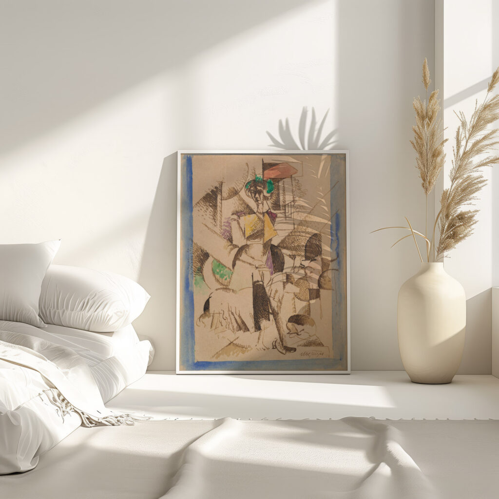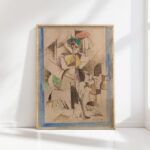 “La Dame aux bĂȘtes, Portrait de Madame Raymond Duchamp Villon” by Albert Gleizes showcases a complex interplay of geometric shapes, lines, and contrasting tones. The central figure appears entwined with both domestic and wild animal motifs, suggesting a harmony between humanity and nature. This work embraces the fragmented perspectives characteristic of Cubism while infusing elements of abstraction and figuration, as well as highlighting Gleizes’ skillful use of shading and contour to create a dynamic visual narrative.
