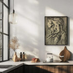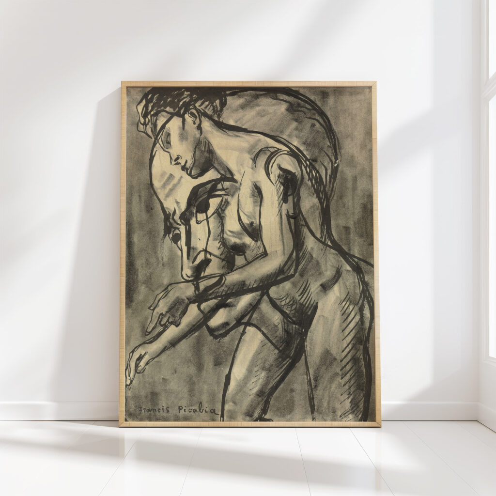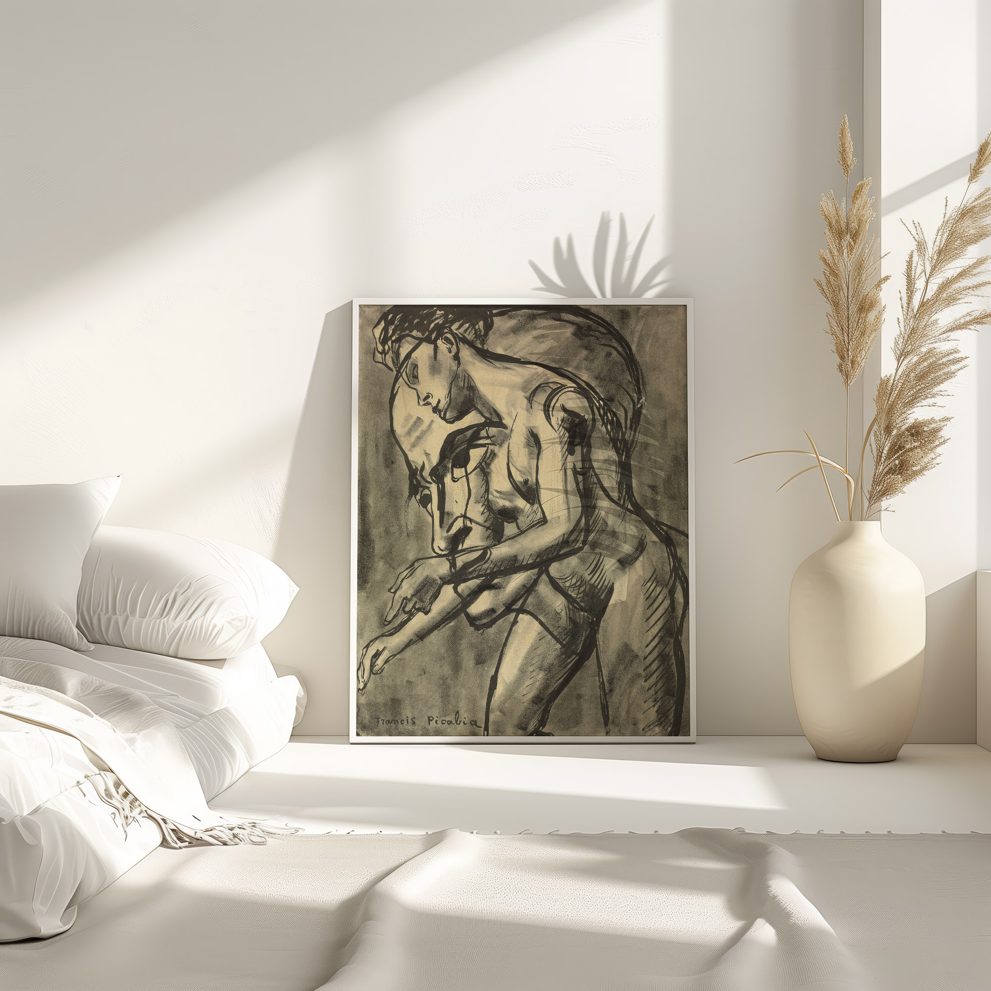 In “Sans titre (circa 1932) – Francis Picabia,” the viewer is presented with a dynamic and stylized representation of a human figure. The lines are sweeping and expressive, suggesting movement and a sense of depth. The monochromatic palette adds to the print’s timeless quality, while the abstraction in the figure’s form indicates a departure from traditional representation, leaning towards a more interpretive and emotionally charged depiction. The artwork exudes a feeling of contemplation through the posture and positioning of the figure, inviting viewers to engage with the print on a deeper level.