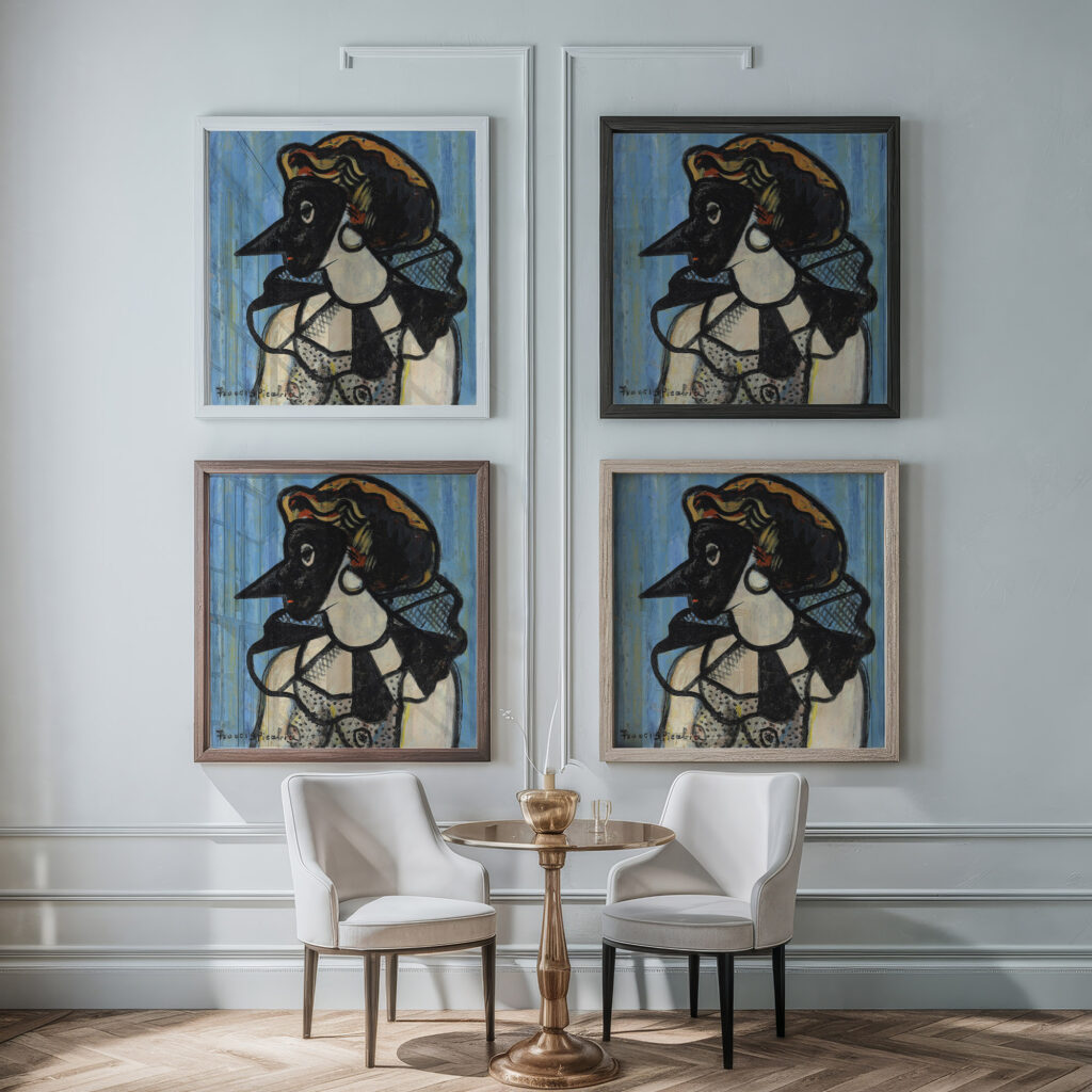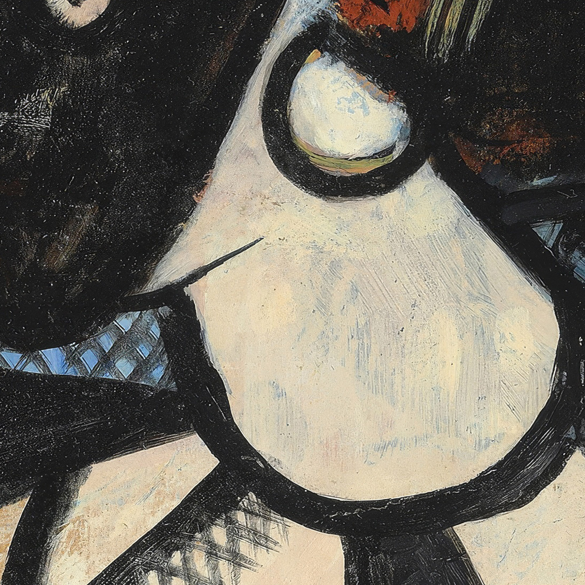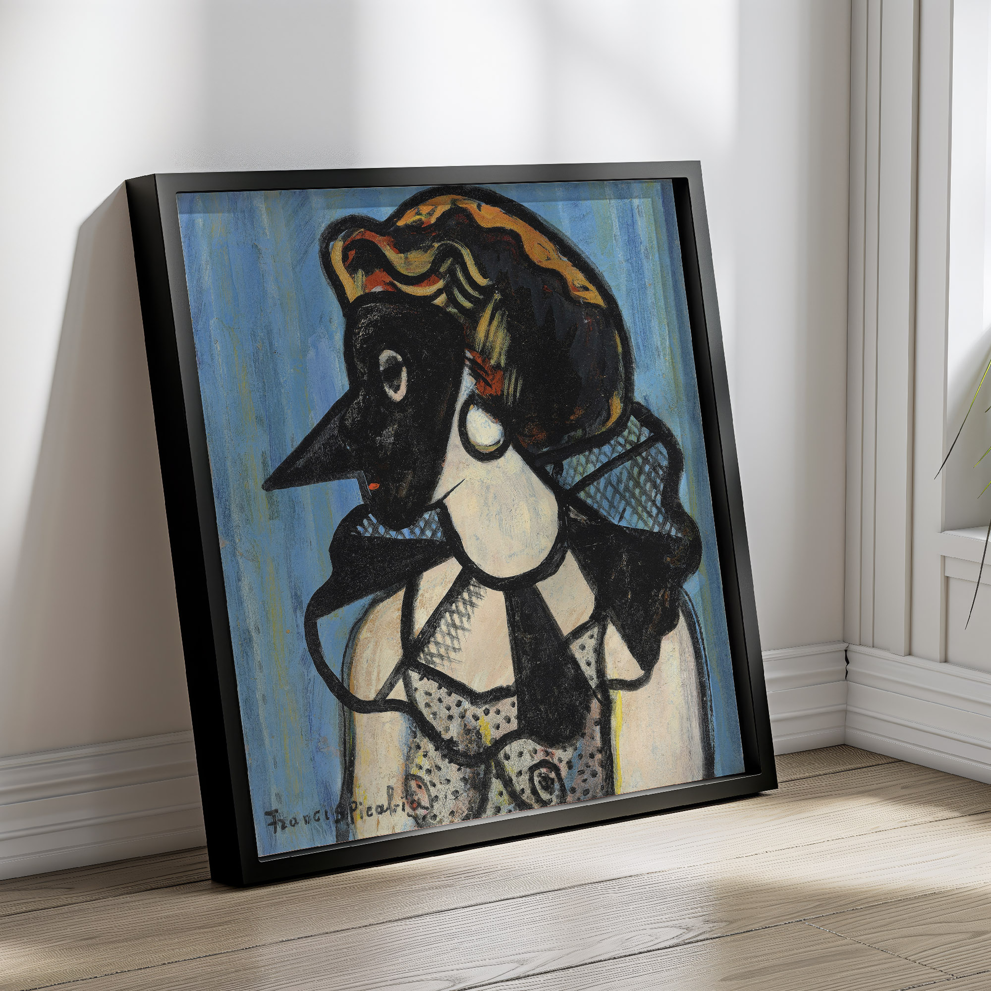 This print by Francis Picabia, “Femme au masque,” presents an abstracted female subject wearing an elaborate mask that draws the viewer’s focus. The composition is striking, with the mask’s sharp contours and dark color standing out against the lighter hues of the figure’s dress and background. The textured brushwork and layered colors create depth, while the interplay of figuration and abstraction invites contemplation. The woman’s attire suggests sophistication, and the choice of a mask introduces themes of identity and perception.