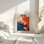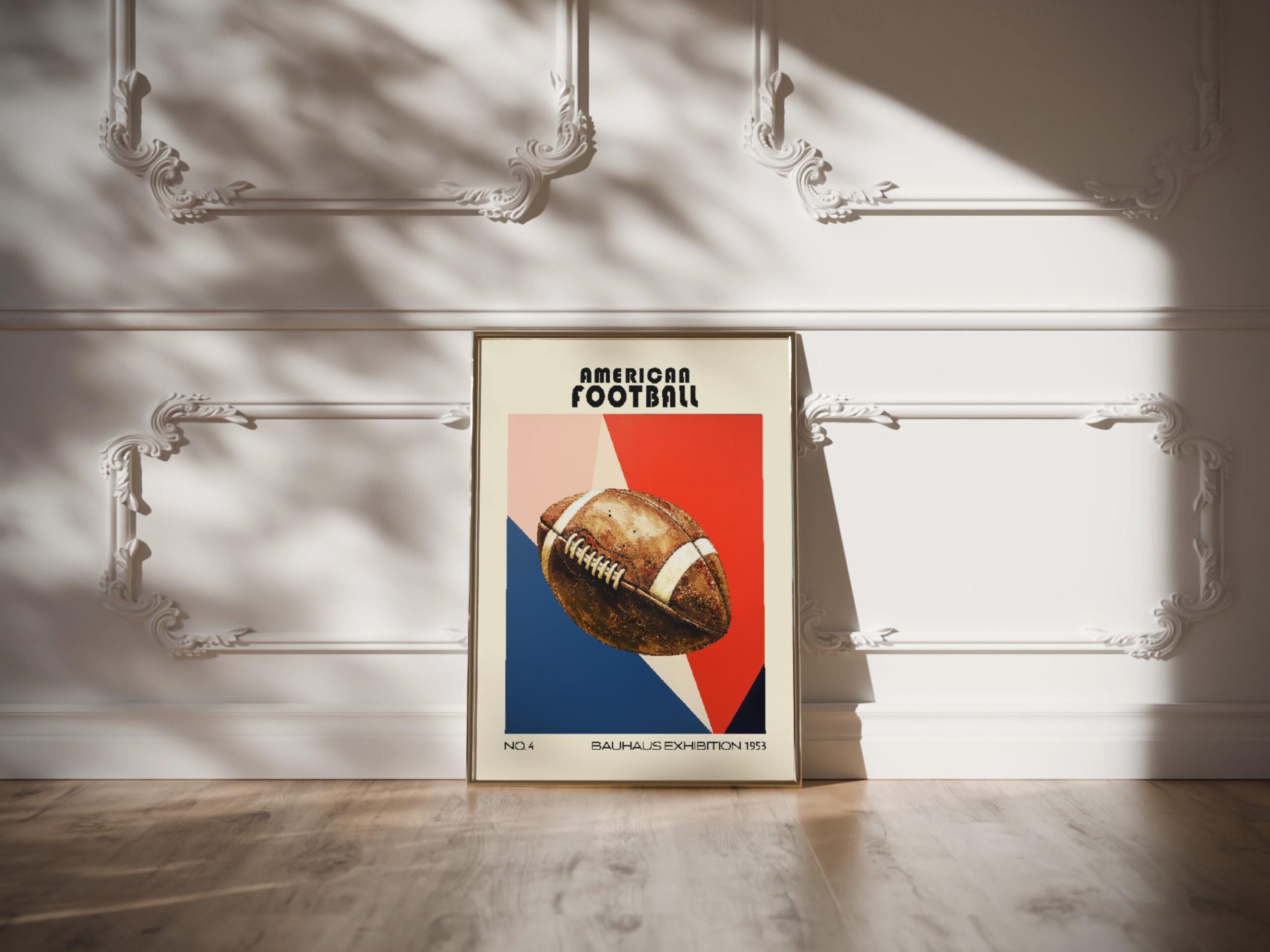 This striking print features a hyper-real depiction of an American football, set against a bold, mid-century inspired geometric background embodying the dynamic essence of the sport. The juxtaposition of the rustic-looking football with sharp angles and bright, contrasting colors creates a visually arresting piece that conveys movement and energy. Perfect for sports enthusiasts and lovers of retro design, this print brings a touch of timeless nostalgia to any modern interior.