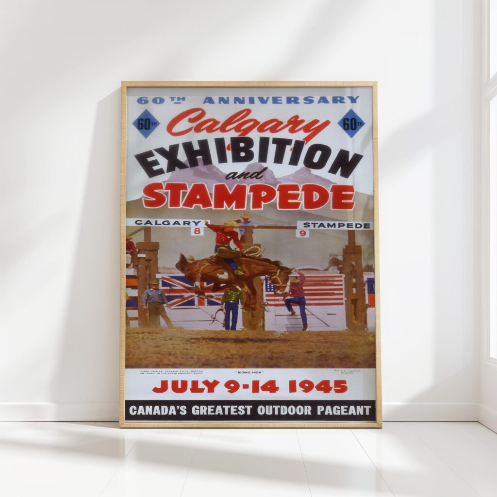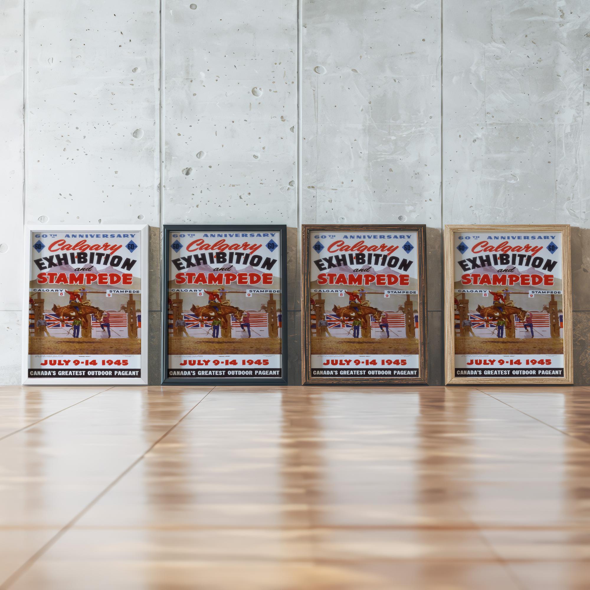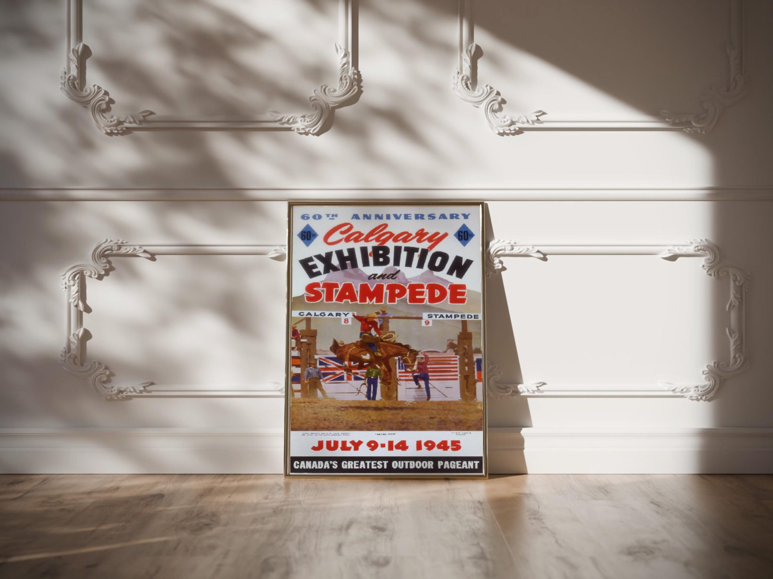 This dynamic print captures the thrilling essence of a rodeo with a cowboy expertly riding a bucking bronco. The background features eye-catching typography that reflects a sense of history and celebration. The spirited action of the horse and the concentration of the rider at the heart of a cheering crowd invoke a feeling of excitement and tradition associated with such events. The bold lettering and rich colors add to the pageantry of the rodeo atmosphere, making this print an ideal choice for those who appreciate Western themes and the spirit of adventure.