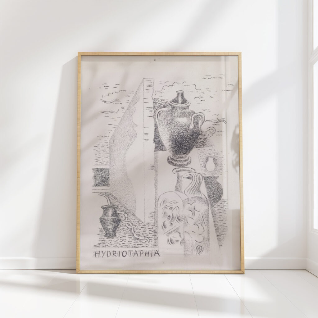 The “Hydriotaphia” by Paul Nash displays a surreal and abstract design centering around an intricately detailed urn. To the urn’s side, there is a contrasting geometric form that resembles a ruler or measurement device, introducing a sharp juxtaposition against the organic curves of the urn. Behind these elements, a subtly rendered background evokes the feeling of a distant, rippled seascape, adding a sense of place without overwhelming the central subjects. The piece evokes contemplation on the relationship between the classical and the abstract, the tangible and the imagined.