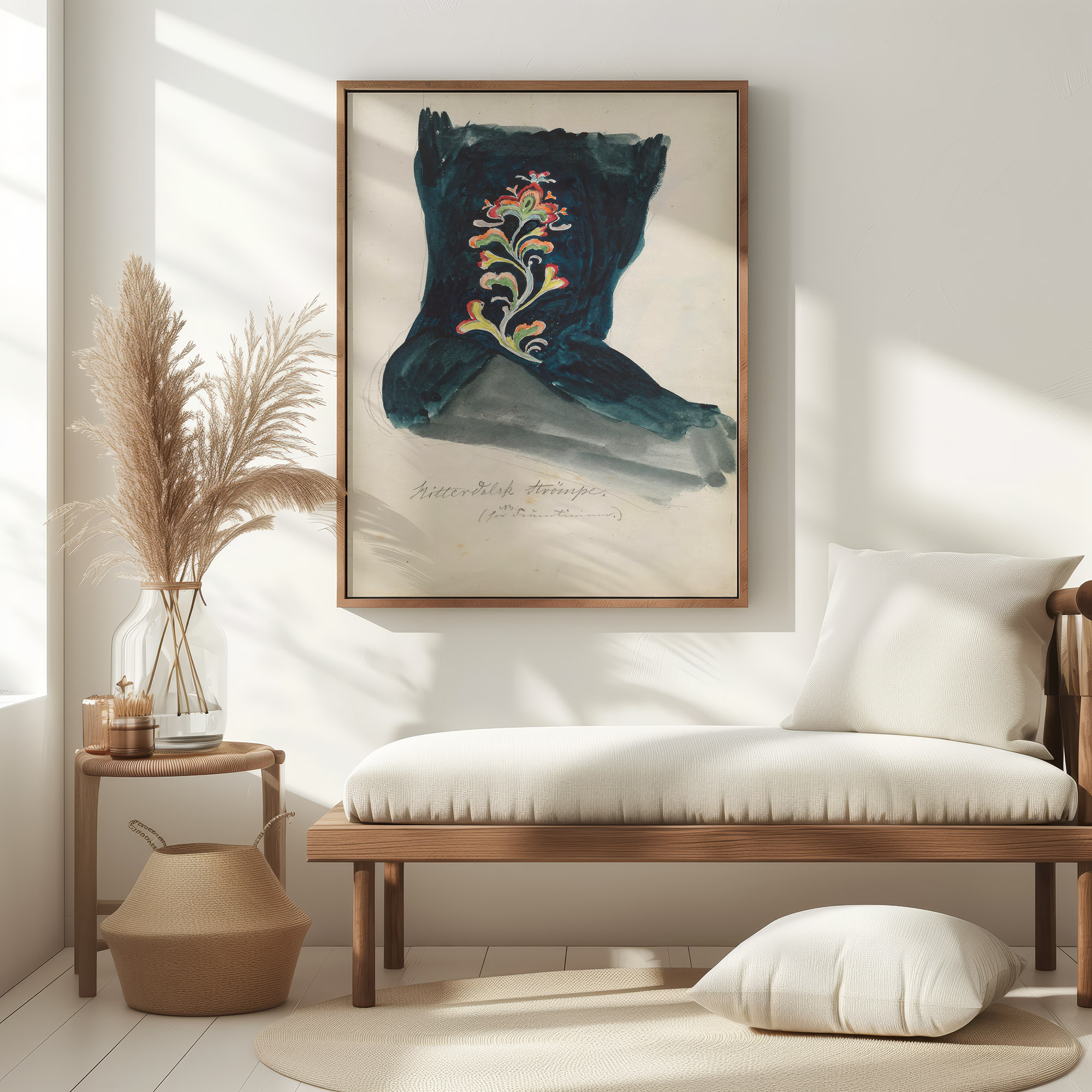 This artwork by Adolph Tidemand, titled “Strømpe, Heddal,” showcases a solitary, dark-colored stocking adorned with vibrant, elaborate floral embroidery. The design reflects the meticulous craftsmanship that characterizes traditional Norwegian clothing and highlights the artist’s attention to detail and cultural representation. The print captures the essence of folk art and historical fashion, evoking a sense of cultural heritage and artistic expression. The use of color contrasts sharply with the dark background, drawing the viewer’s eye to the embroidery’s intricate patterns and making it a distinctive piece with a strong cultural narrative.