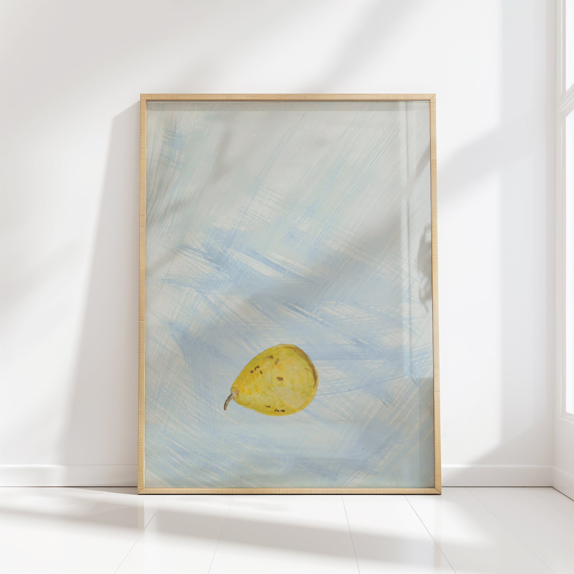 “Still life” by David Shterenberg displays a singular pear with a visible texture, situated at the center against swirling strokes of blue, imparting a sense of calm. The artwork captures the essence of the subject, emphasizing the natural beauty of everyday objects.