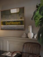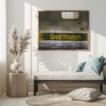 This captivating print showcases the iconic Great Western text, set against a background of horizontal lines that give an impression of motion and speed, reminiscent of the golden age of rail travel. The warm color palette creates a nostalgic ambiance, inviting the viewer into a bygone era of grand locomotives. Subtle reflections and details such as windows add depth to the image, making it a conversation starter. Ideal for enthusiasts of rail history or collectors of train memorabilia, this print serves as a timeless tribute to the enduring legacy of train travel.