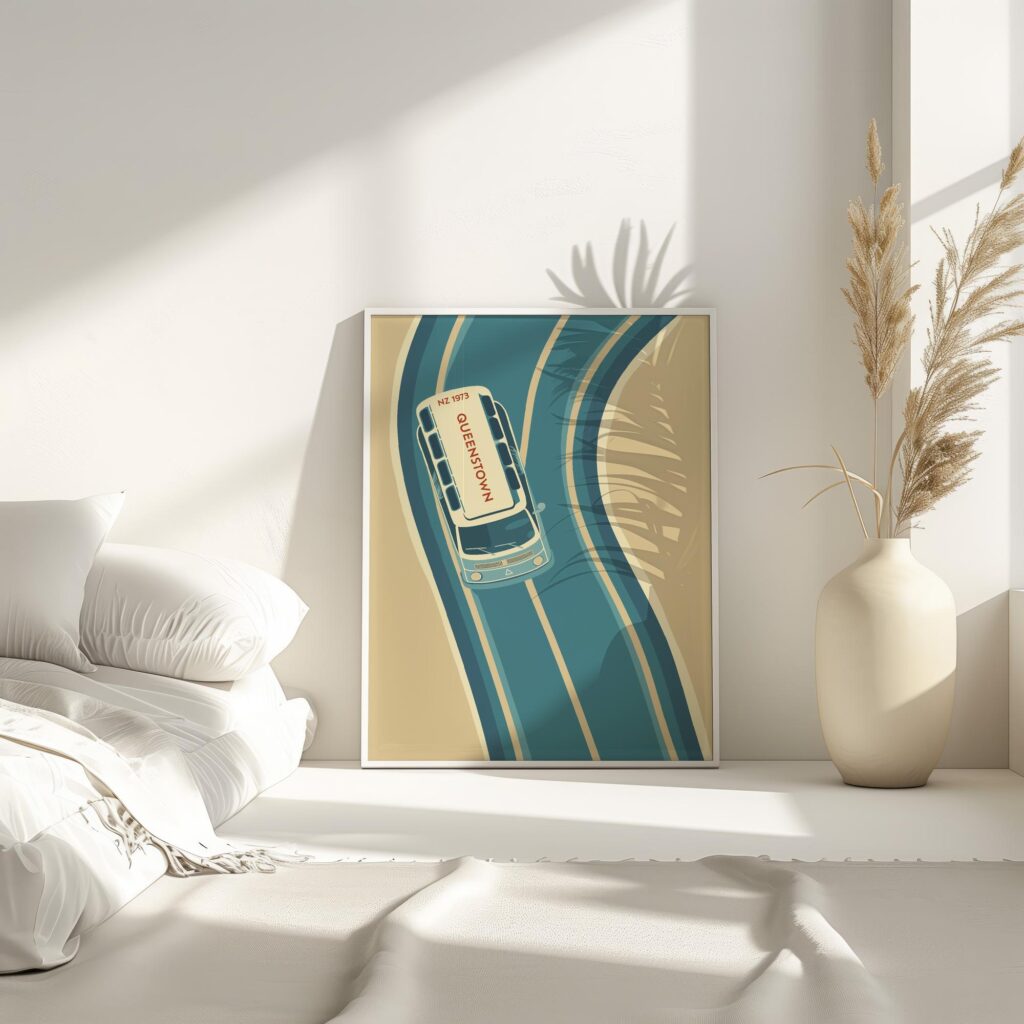This high quality print showcases a charming retro bus as it travels along a winding road, evoking a sense of calm and simplicity. The pastel color palette adds a touch of softness to the composition, making it an ideal piece for anyone wishing to create a serene atmosphere. Drawing on mid-century design influences, this print captures the essence of stylish simplicity and is perfect for those who appreciate vintage aesthetics. Whether you’re looking to add a touch of retro charm to your living room, office, or as a unique gift, this print is sure to captivate and inspire.