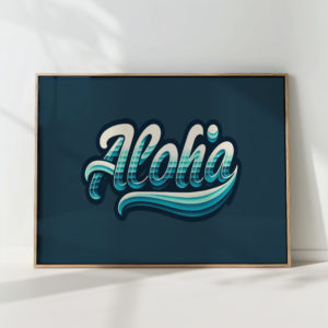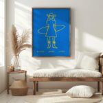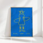 This vibrant print features a stylized illustration of a cowgirl holding a surfboard. The striking blue background contrasts with the yellow line art, creating a playful and modern look. Words howdy and aloha at the bottom blend Western and tropical vibes, suggesting a fusion of cultures. This piece infuses humor and a sense of fun, perfect for those looking to add a whimsical touch to their space. It’s an excellent choice for a beach house, a quirky living room, or a modern gallery wall.