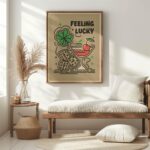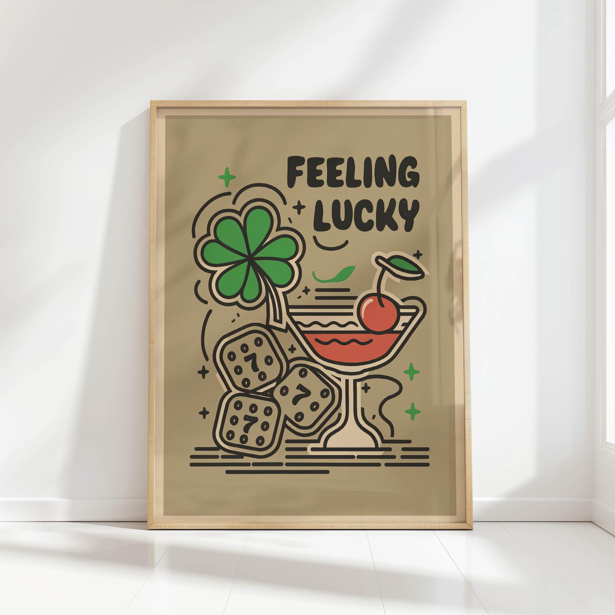This “Feeling Lucky” print captures the essence of classic gambling and good fortune with a whimsical twist. Featuring stylized dice, a vibrant cocktail with a cherry, and a four-leaf clover symbolizing luck, this artwork brings a touch of retro charm to any space. The playful design and neutral color palette make it a versatile addition, ideal for enhancing a game room, bar area, or any spot where you want to invoke the fun and excitement of feeling lucky.