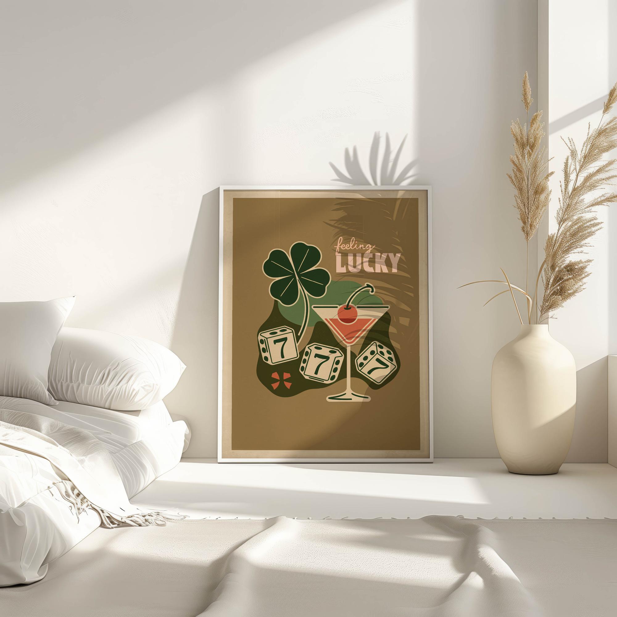 This inviting typography print features the phrase “Feeling Lucky” in a stylized font, set against a neutral backdrop that evokes a sense of vintage charm. The design includes classic symbols of good fortune and gambling – a vibrant four-leaf clover, a pair of lucky dice, and an elegant martini glass complete with a cherry. It’s a whimsical nod to casino culture, perfectly blending nostalgia with a touch of modern sophistication. This print is ideal for those who appreciate the thrill of luck and the allure of playful, retro aesthetics in their decor.