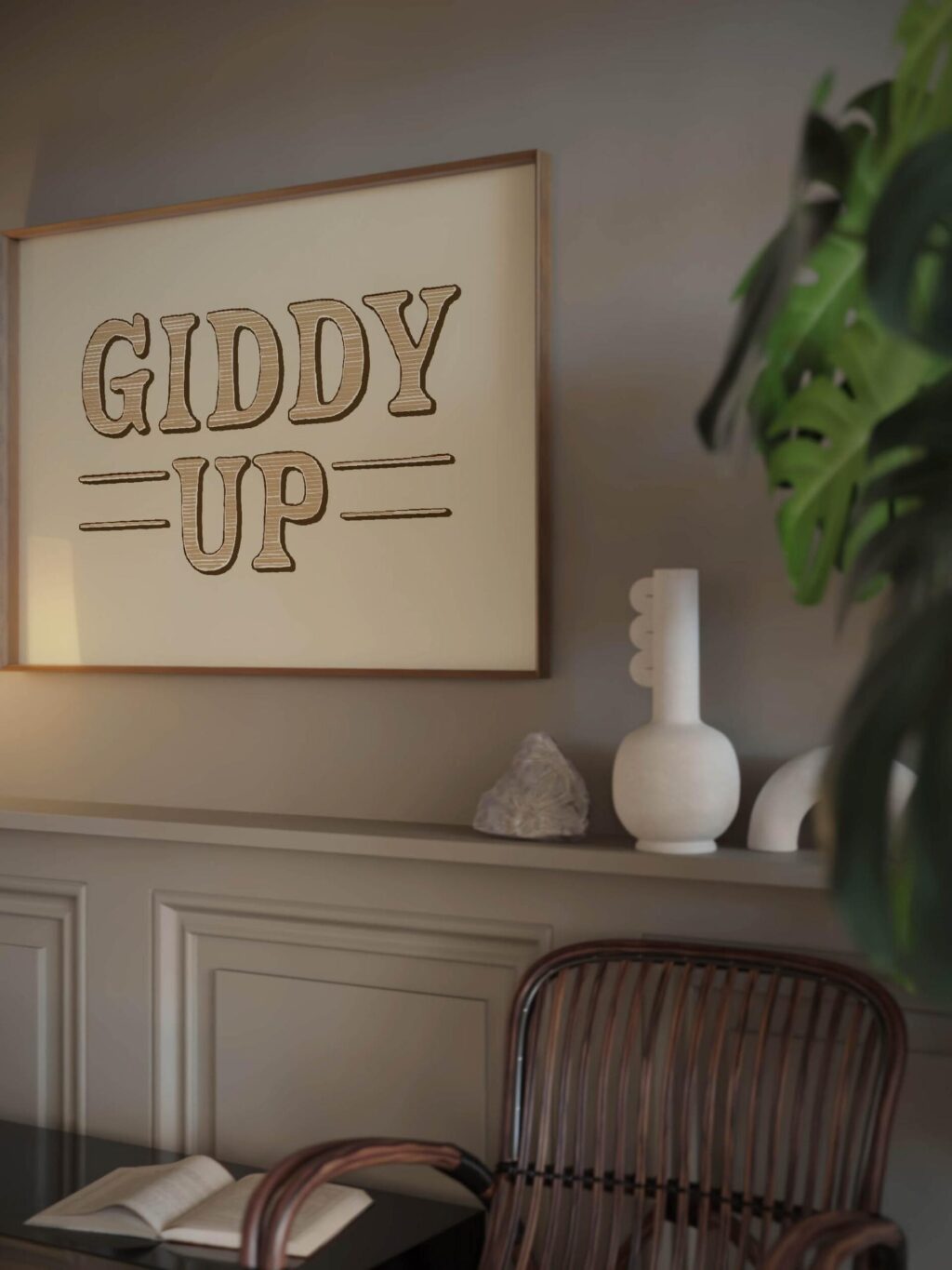 This Typography Print features the phrase “Giddy Up,” presented in a vintage western style font that harkens back to classic Americana. The neutral color palette ensures it will complement any room, where its timeless design encourages feelings of excitement and action. Ideal for anyone looking to add a touch of inspiration to their living space, this print captures the essence of a motivational call to action with a fun and lighthearted twist.