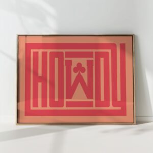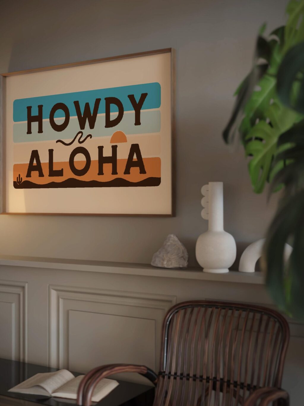 This vibrant print features the warm greetings Howdy and Aloha in bold, friendly lettering, set against a backdrop that suggests a serene setting sun. The top tier with the word ‘Howdy’ reflects a cool blue sky, while the bottom tier with ‘Aloha’ is awash with warm sunset hues, accompanied by a silhouette of a desert cactus. This print evokes a sense of hospitality and relaxed vibes, perfect for those looking to add a touch of warmth and a welcoming atmosphere to their living space. Ideal for entryways or communal areas, it blends cheerful ambiance with minimalistic design.