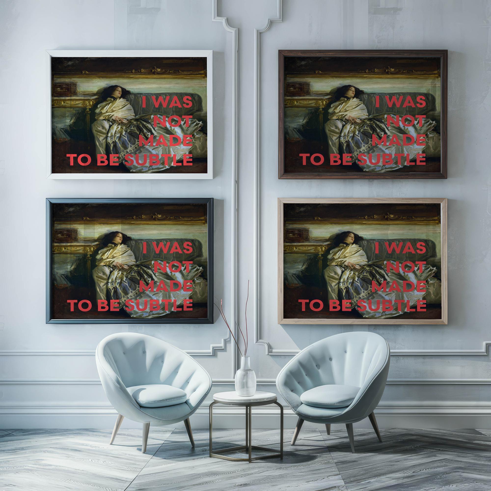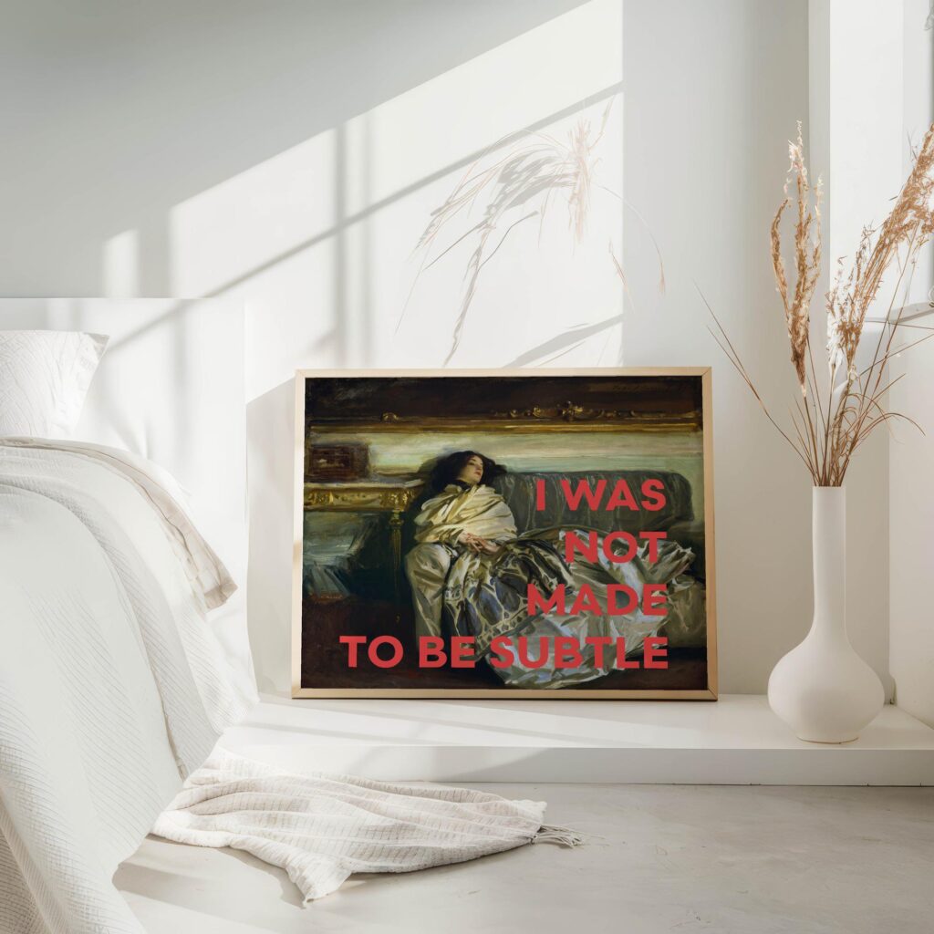 This striking print features the statement “I Was Not Made To Be Subtle” in bold, assertive text set against the backdrop of a timeless art piece. The composition showcases a relaxed woman draped in flowing garments, exuding an aura of confident repose on an ornate chair. This powerful juxtaposition of modern typography with a classical portrait creates a dynamic visual experience that speaks to the viewer’s inner strength and individuality. Perfect for adding a touch of vibrant inspiration to any room, this print is a conversation starter and a declaration of self-assuredness.
