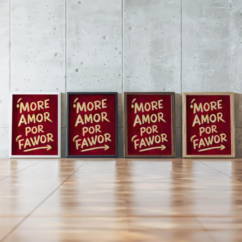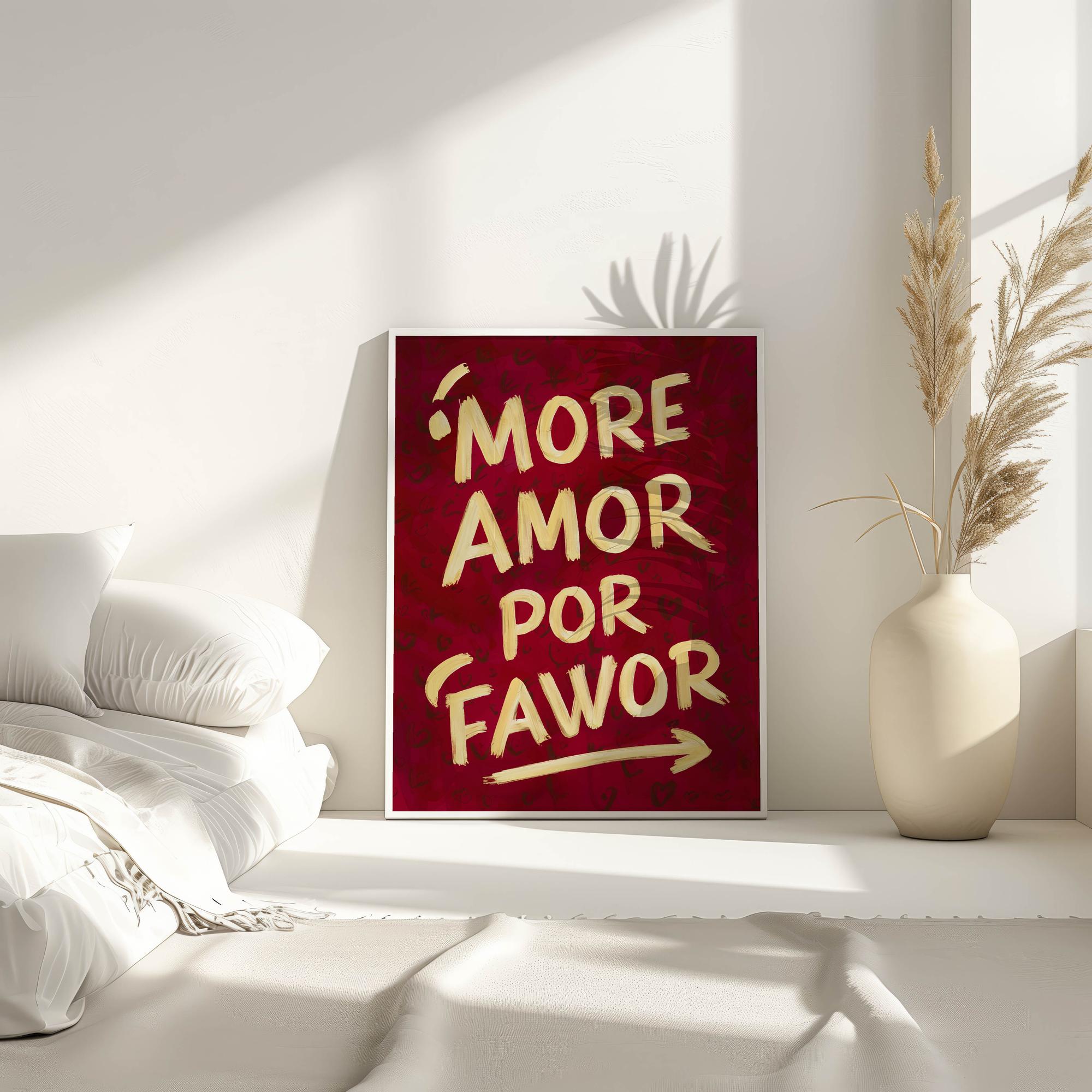 This print titled “More Amor Por Favor” captures the essence of a heartfelt request with an artistically rendered typography design. The vibrant warm hues set against a richly textured red background evoke a sense of passion and energy. Stylized brushstrokes infuse the artwork with a contemporary feel, while small hearts scattered throughout add a touch of whimsy. The arrow at the bottom points forward, symbolizing the movement and direction of love. It’s not just a typical wall decoration but a call to spread love more generously in our lives.