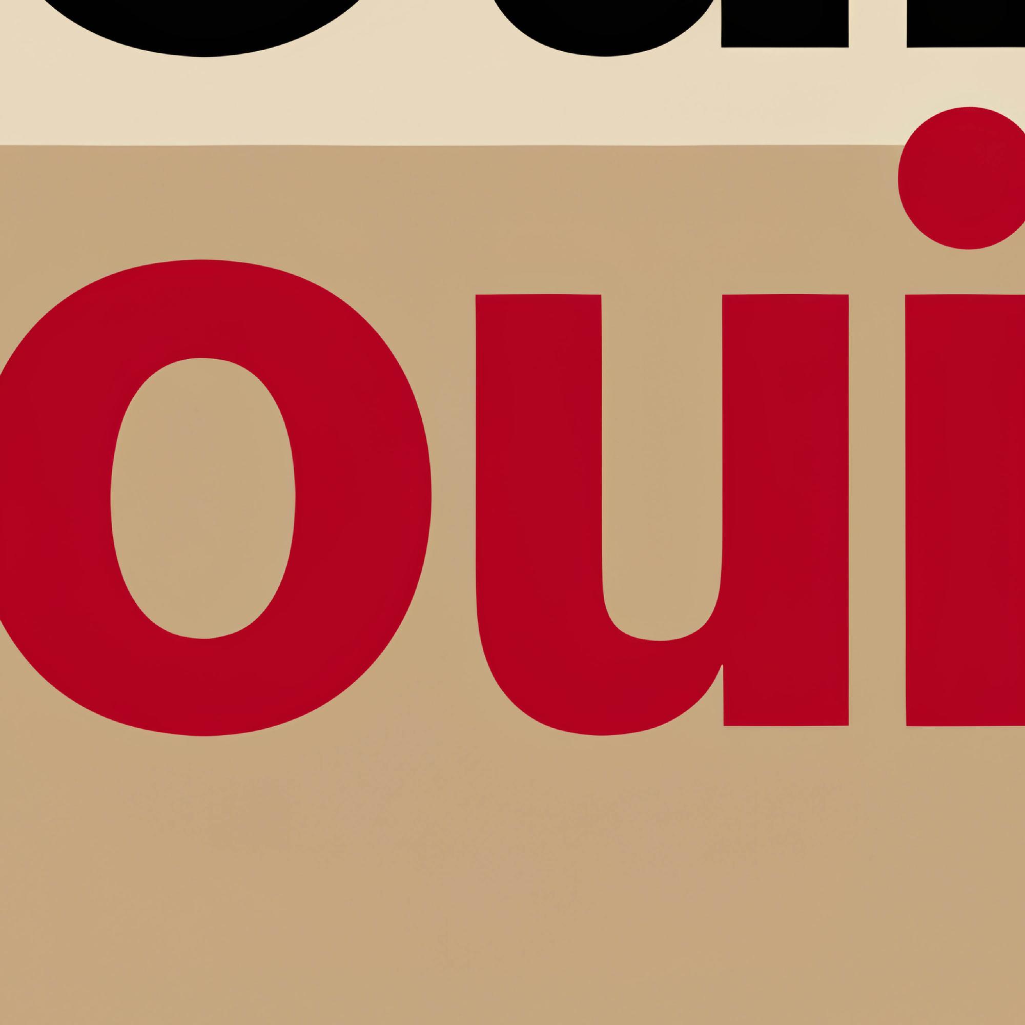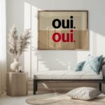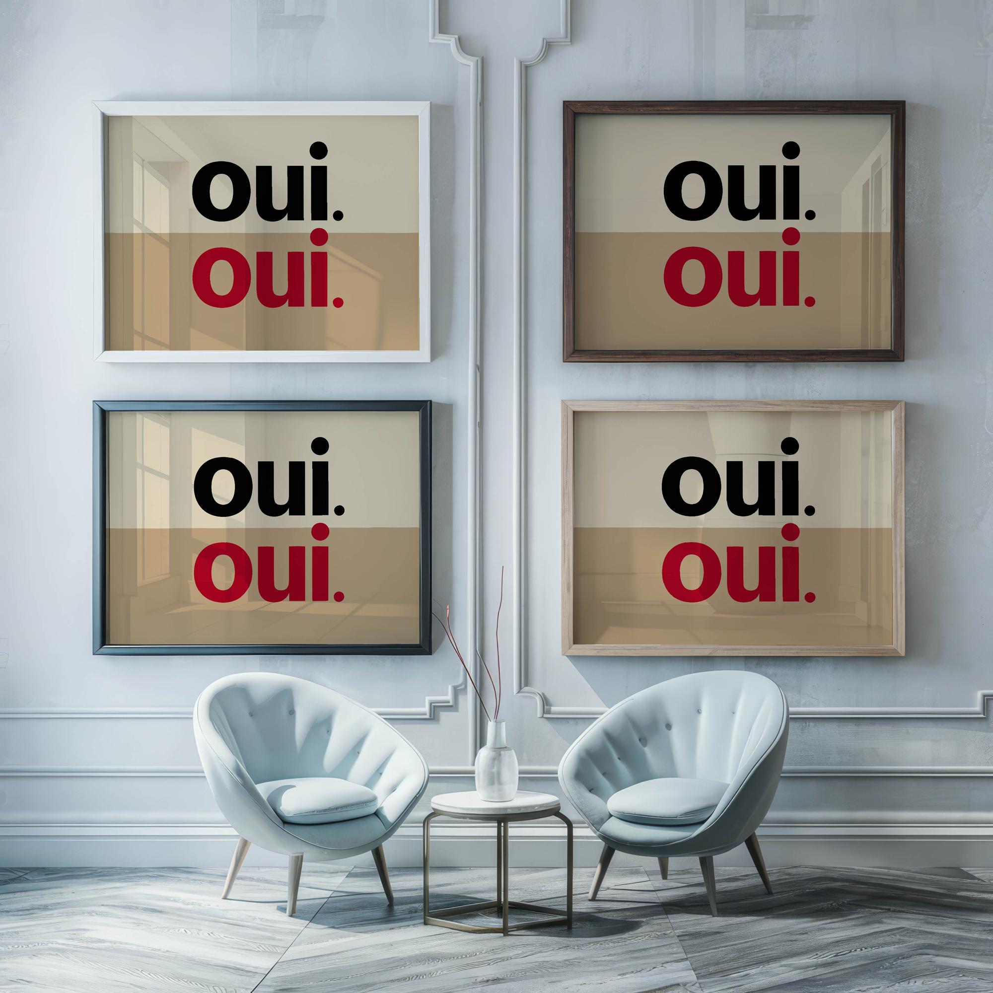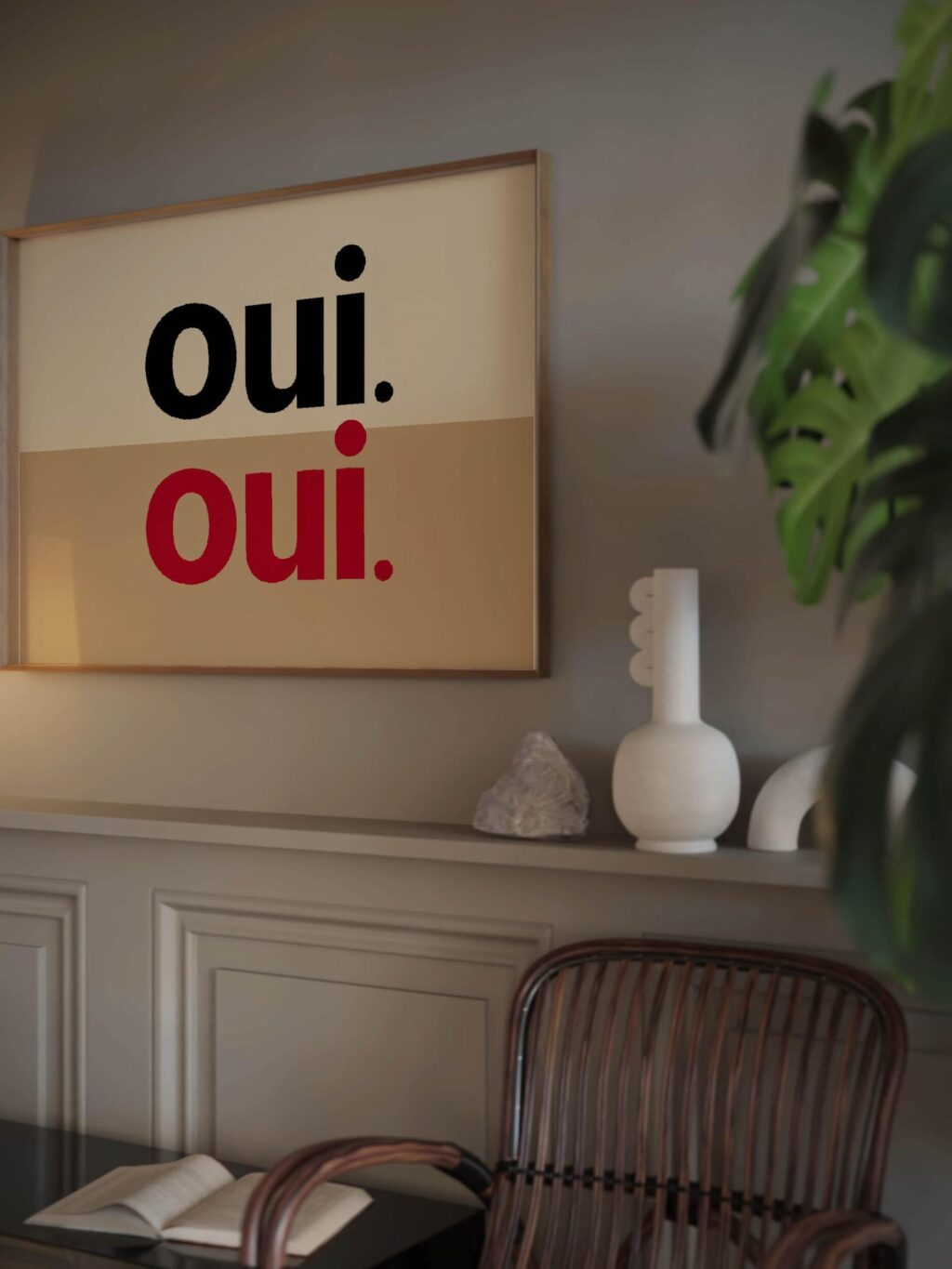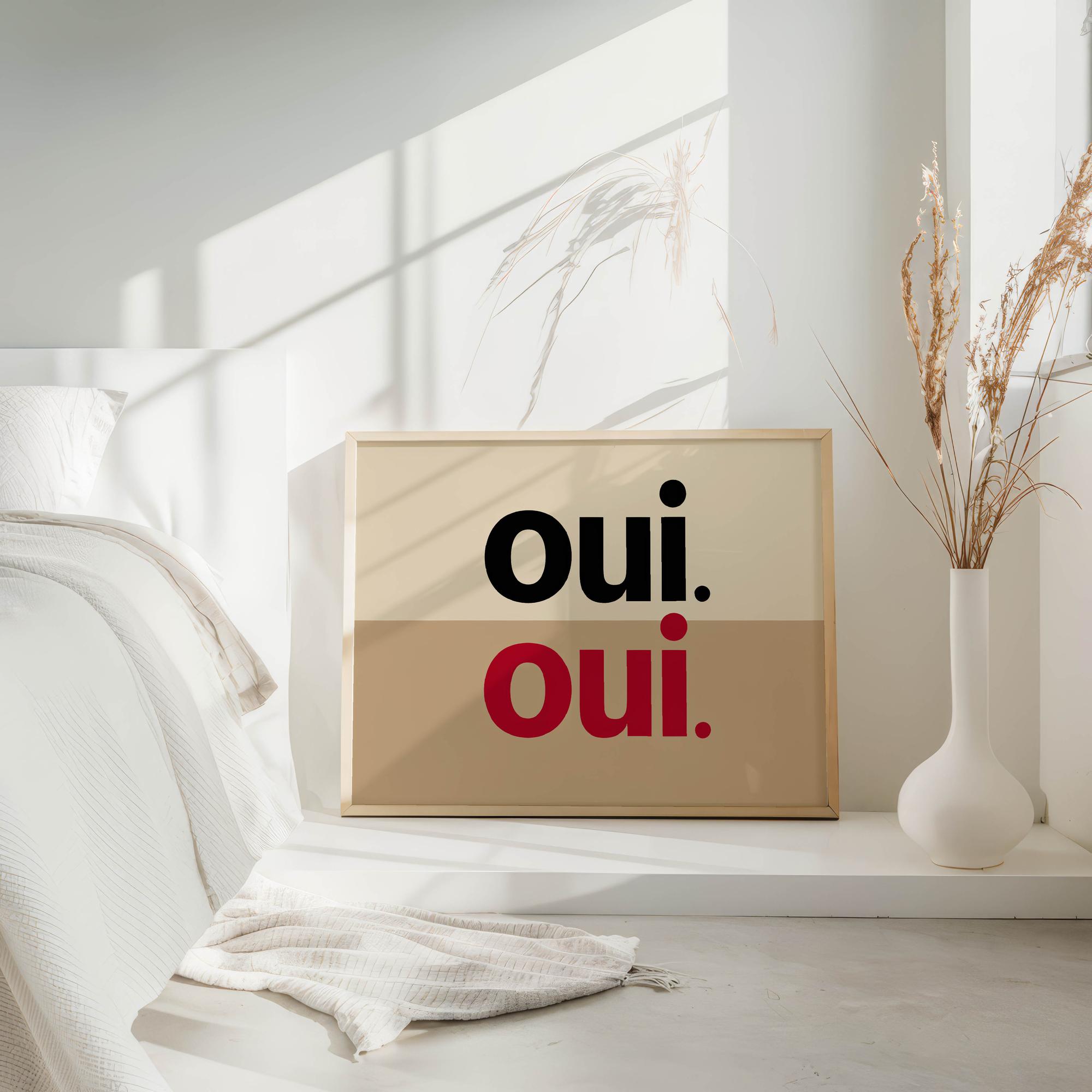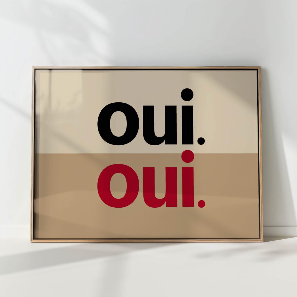This high-quality print features the word “Oui.” repeated with a bold and minimalist flair. One “Oui.” is printed in stark black atop a warm beige background, while the other is in a vibrant red set against a rich brown, creating an eye-catching and modern contrast. This striking typographic composition delivers a message of affirmation that’s both simple and powerful. This piece is an ideal choice for lovers of modern design looking to add a touch of sophistication and elegance to their home or office space.