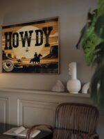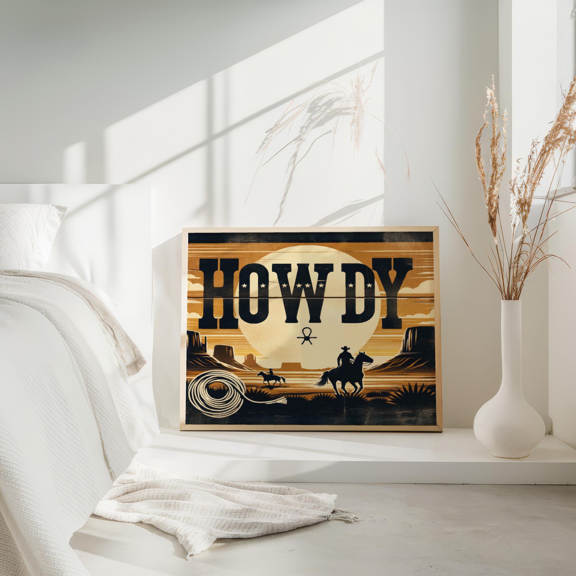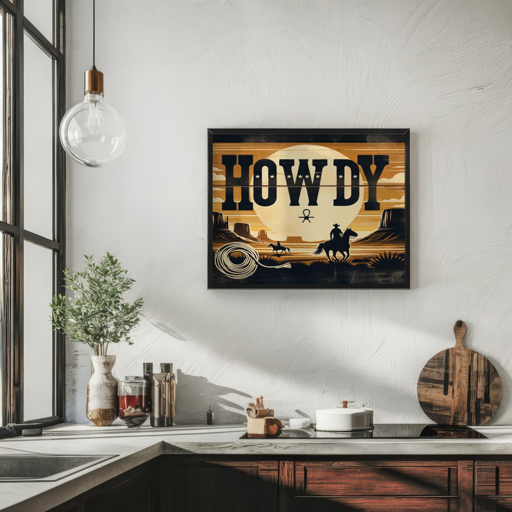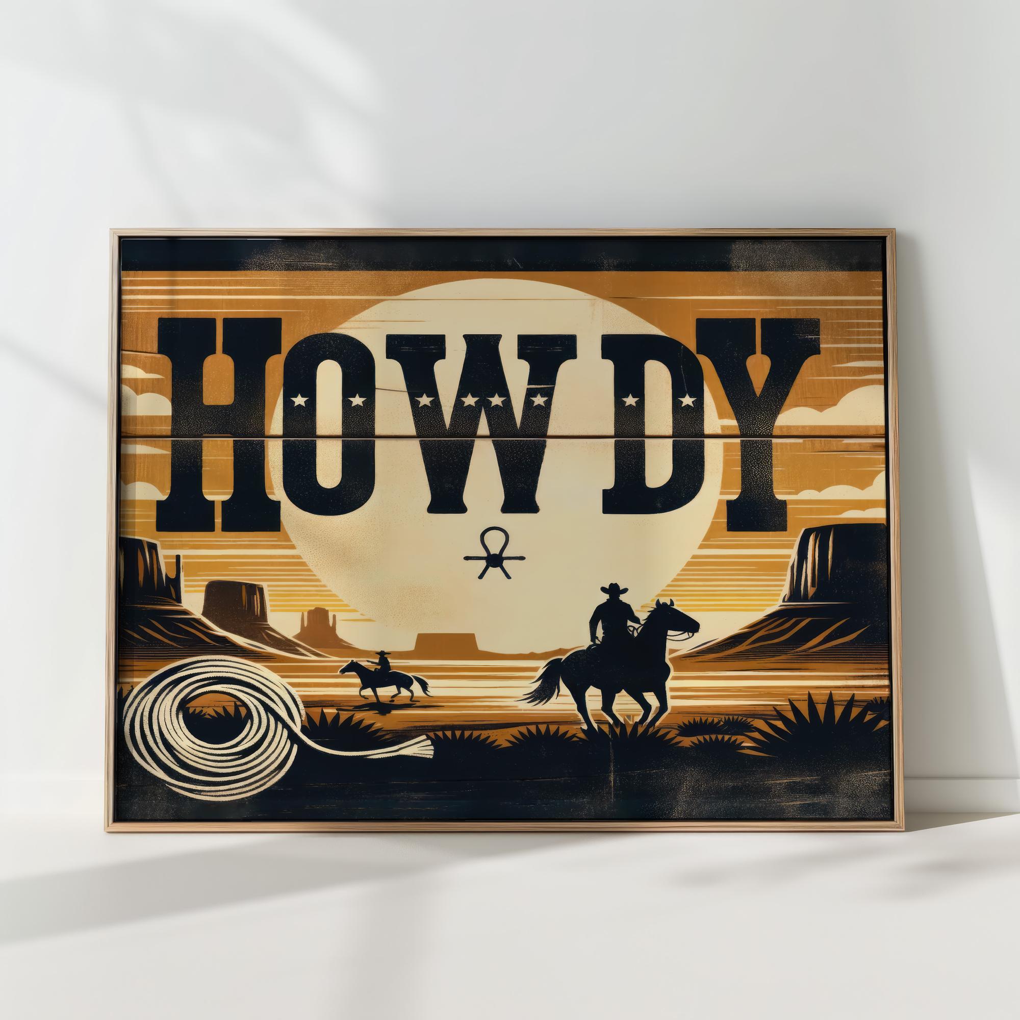 This vibrant art print features the iconic word HOWDY in bold letters set against a backdrop of a full moon. Below, a cowboy on horseback guides his steed across the desert landscape, capturing the essence of the Wild West. The silhouette style lends a timeless quality, while the detailed illustration of the rolling tumbleweeds and desert buttes adds depth. The warm color palette underscores the heat of the scene, and the addition of a small lasso motif ties the Western theme together. This piece is a perfect addition to any space that aims to evoke the spirit and adventure of the American frontier.