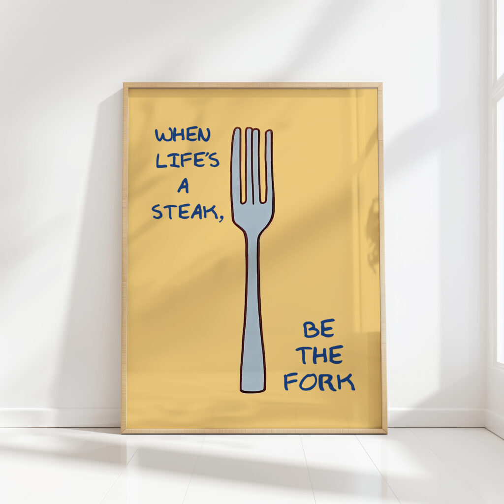 This charming print features a whimsical culinary pun, When life’s a steak, be the fork, set against a warm yellow background. The central image is a simple but striking fork illustration, suggesting that one should take charge and dig into life’s opportunities, much like using a fork to enjoy a good meal. This piece would serve as a delightful reminder in a kitchen or dining room to embrace life’s challenges with gusto. It’s a playful and motivational addition to any culinary lover’s space, bringing a touch of humor and inspiration to the home.
