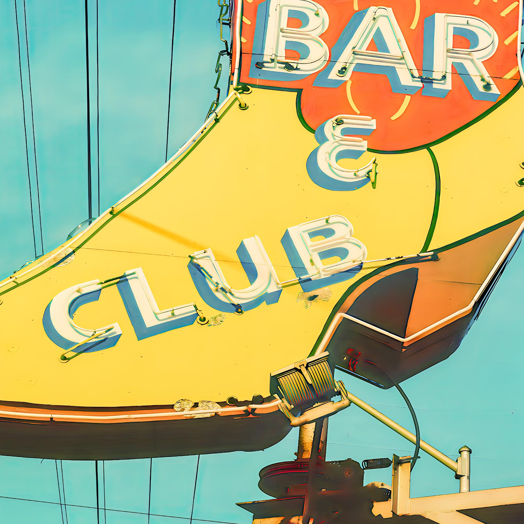 This print captures a classic piece of Americana, featuring a vibrantly colored, neon sign in the distinctive shape of a cowboy boot against a serene sky. The sign, which reads BAR & CLUB, has all the charm of mid-20th-century advertising, with its bold lettering and eye-catching design. While the background features a network of wires, they add an element of complexity to the simple yet iconic subject. This piece of art is perfect for those who appreciate vintage Americana and the golden age of roadside advertisement.